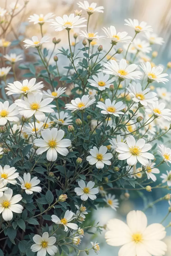 Plakatas Baltų ramunėlių žiedų laukas su žalia lapija neryškiame fone f40413