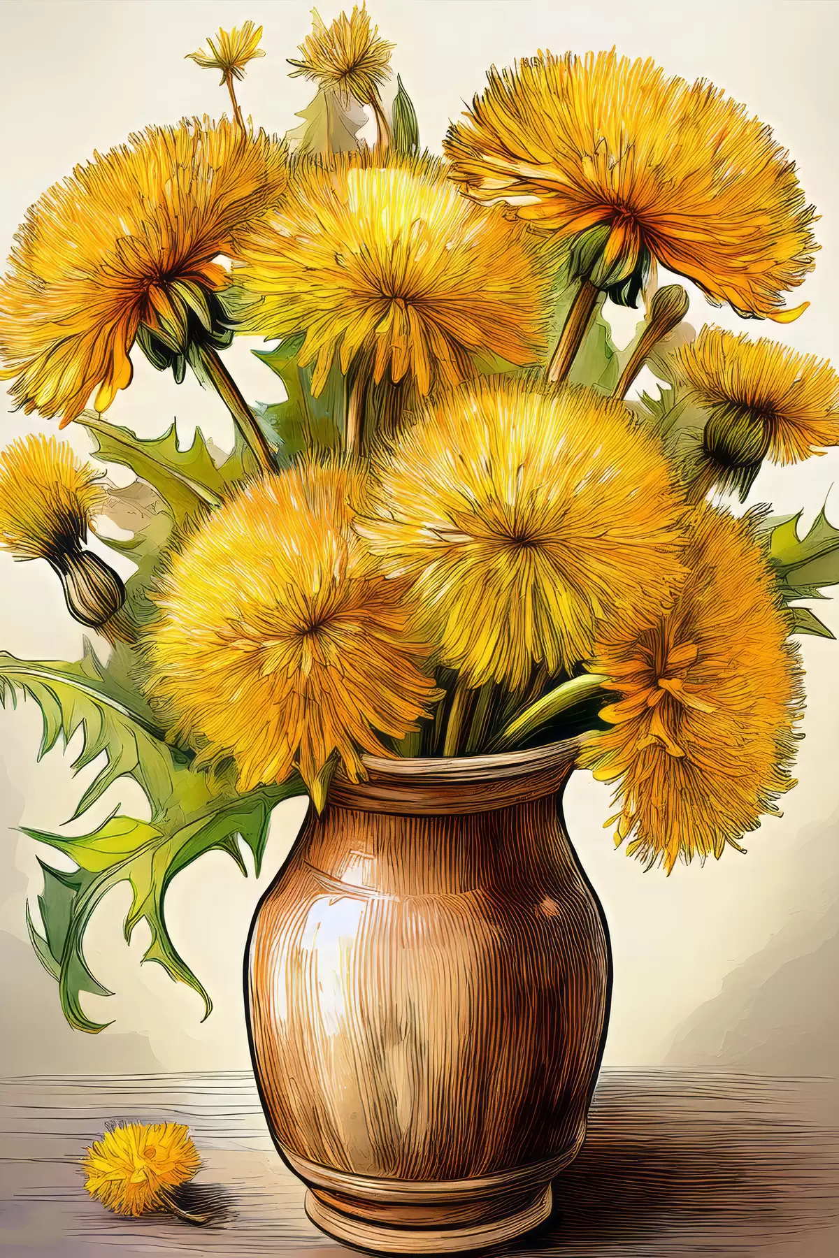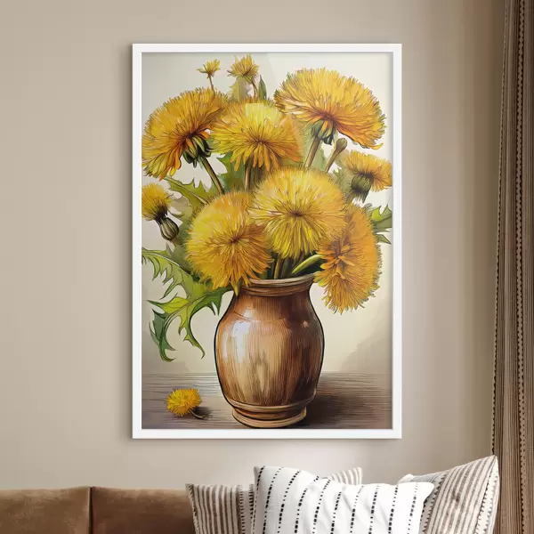 Plakatas kiaulpienės, kiaulpienių puokštė vazone, geltonos kiaulpienės f40418