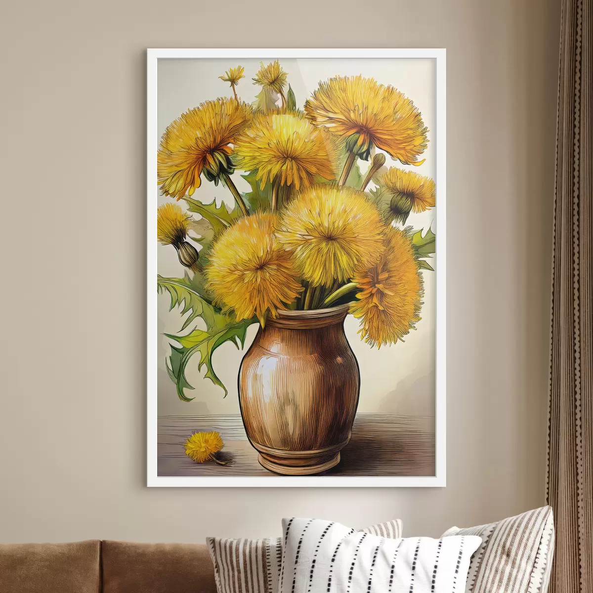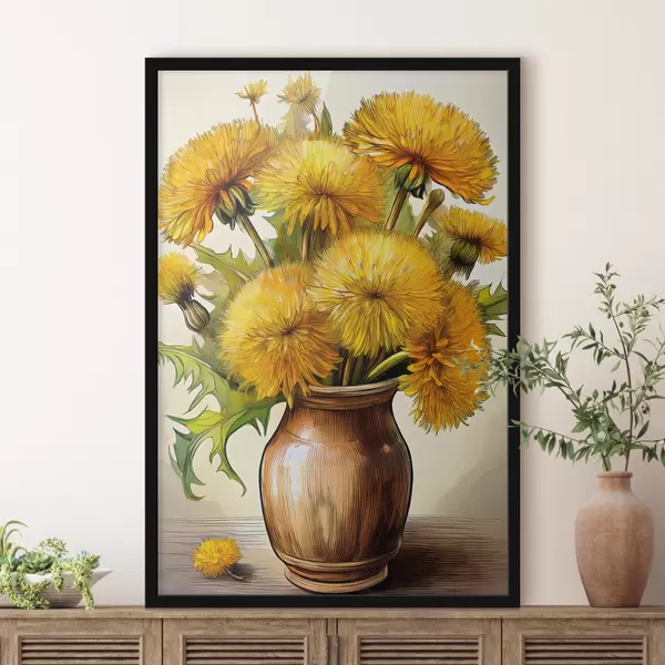 Plakatas kiaulpienės, kiaulpienių puokštė vazone, geltonos kiaulpienės Ne f40418
