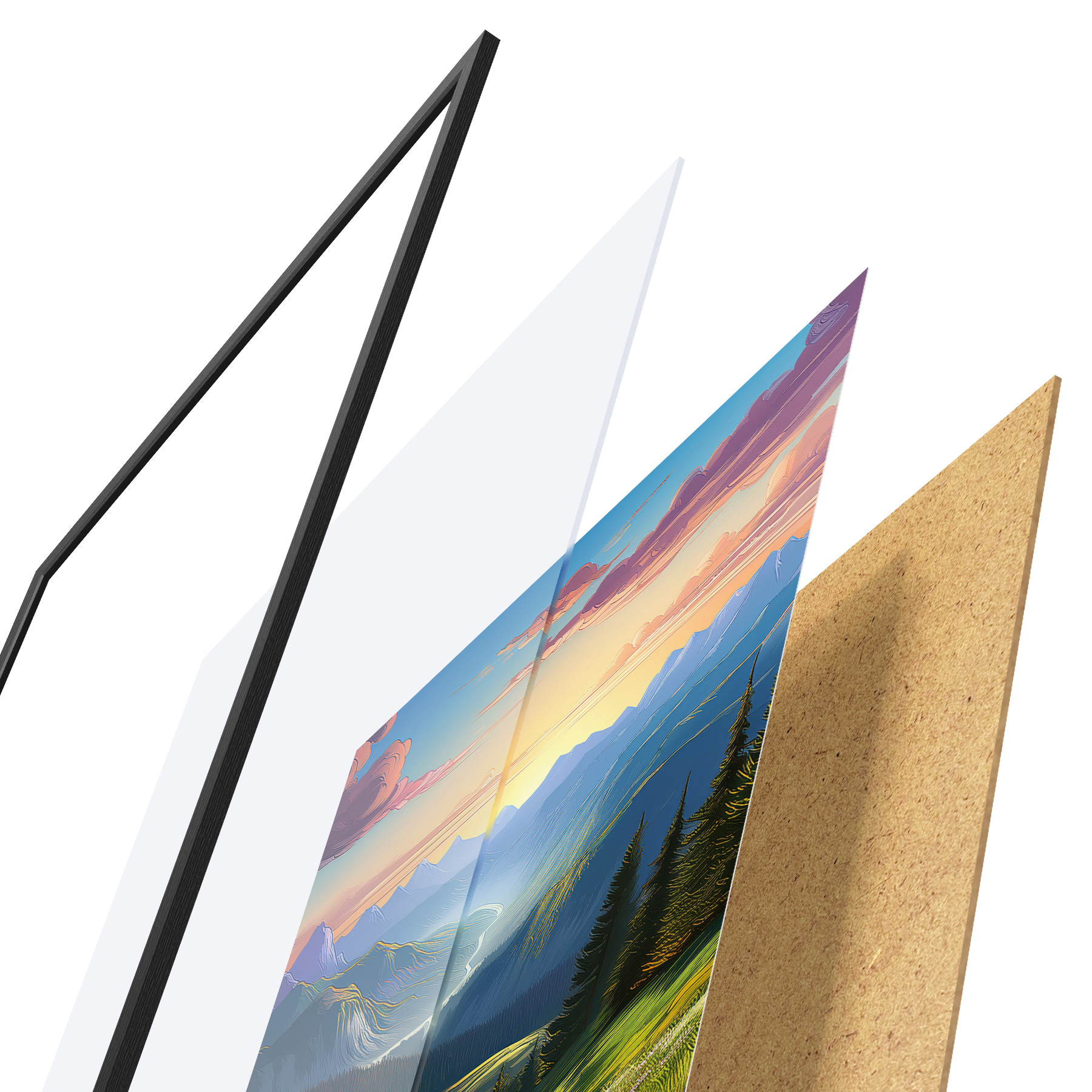 Plakatą sudaro rėmas, pleksiklas, atspausdintas vaizdas ir medžio drožlių plokštės pagrindas. Plakatą galima iš karto pakabinti ant sienos dėl kitoje pusėje esančių laikiklių.