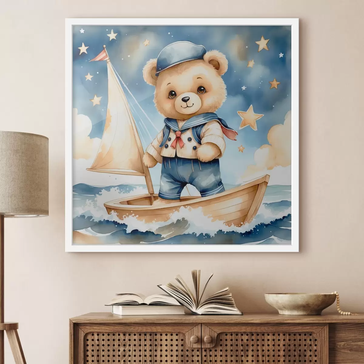 Plakatas Mielas akvarelinis meškiukas valtyje su žvaigždėmis danguje Ne f40429