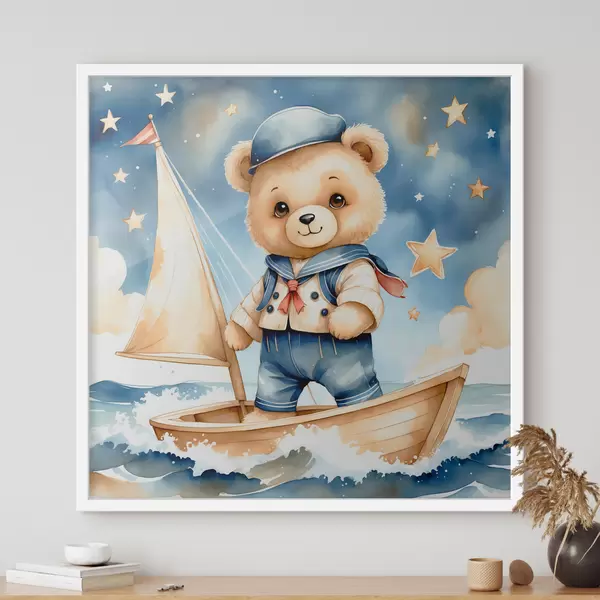 Plakatas Mielas akvarelinis meškiukas valtyje su žvaigždėmis danguje Ne f40429