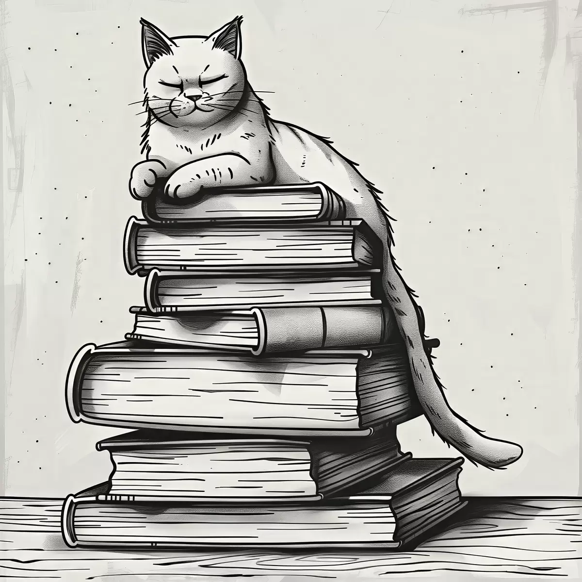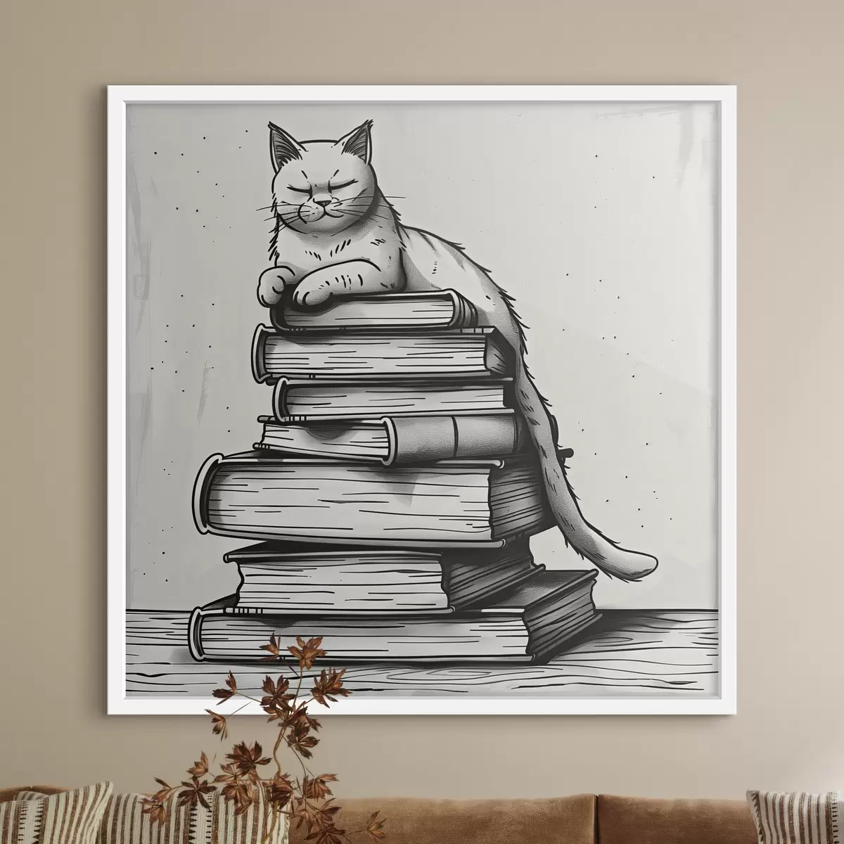 Plakatas Juoda ir balta katė ant knygų krūvos f40435