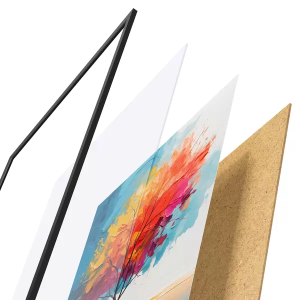 Plakatą sudaro rėmas, pleksiklas, atspausdintas vaizdas ir medžio drožlių plokštės pagrindas. Plakatą galima iš karto pakabinti ant sienos dėl kitoje pusėje esančių laikiklių.