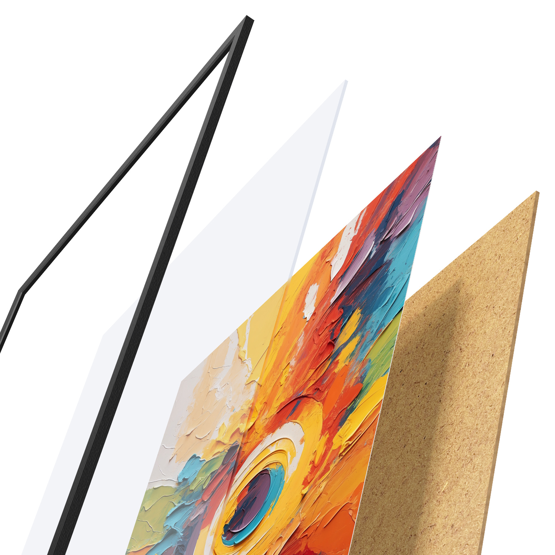 Plakatą sudaro rėmas, pleksiklas, atspausdintas vaizdas ir medžio drožlių plokštės pagrindas. Plakatą galima iš karto pakabinti ant sienos dėl kitoje pusėje esančių laikiklių.