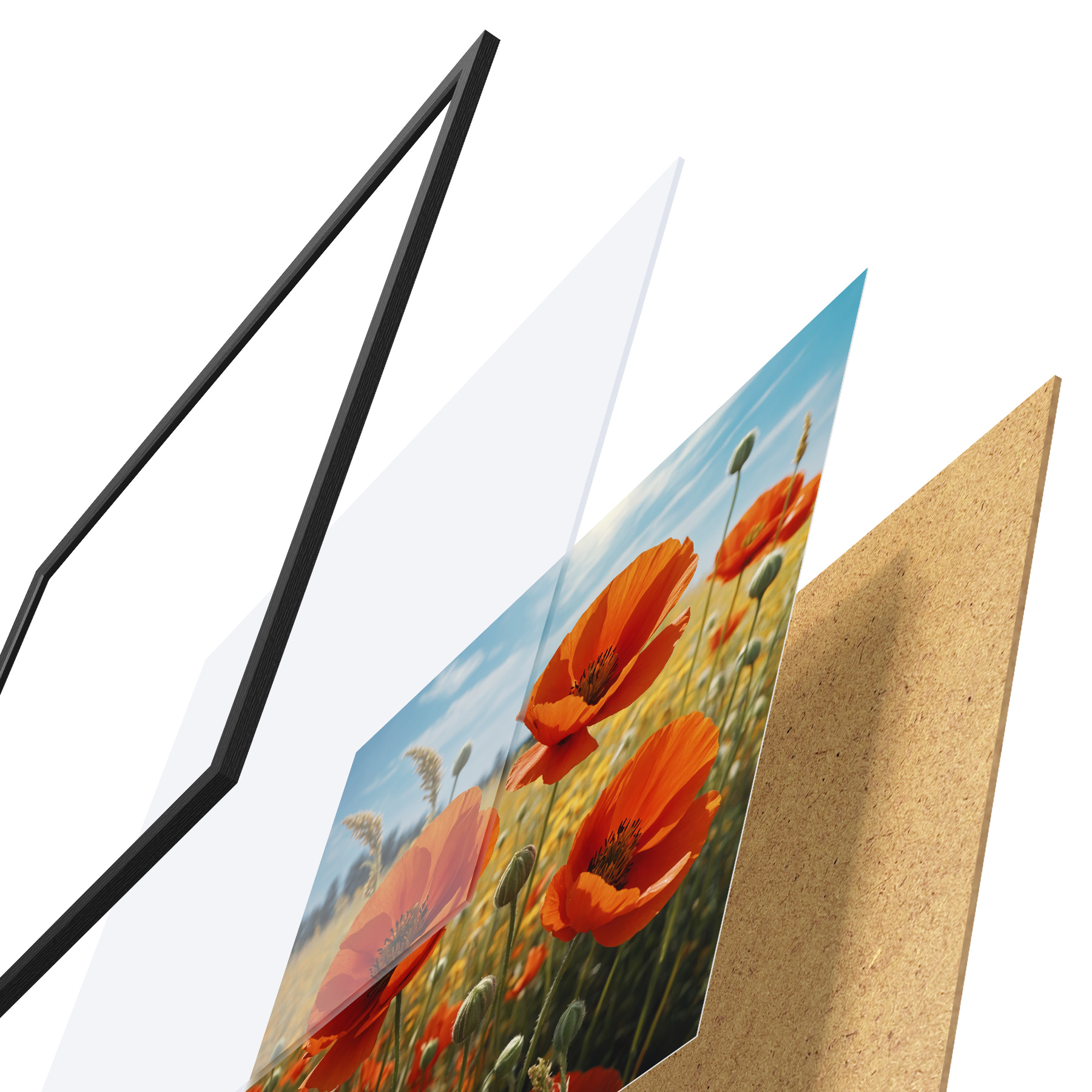 Plakatą sudaro rėmas, pleksiklas, atspausdintas vaizdas ir medžio drožlių plokštės pagrindas. Plakatą galima iš karto pakabinti ant sienos dėl kitoje pusėje esančių laikiklių.