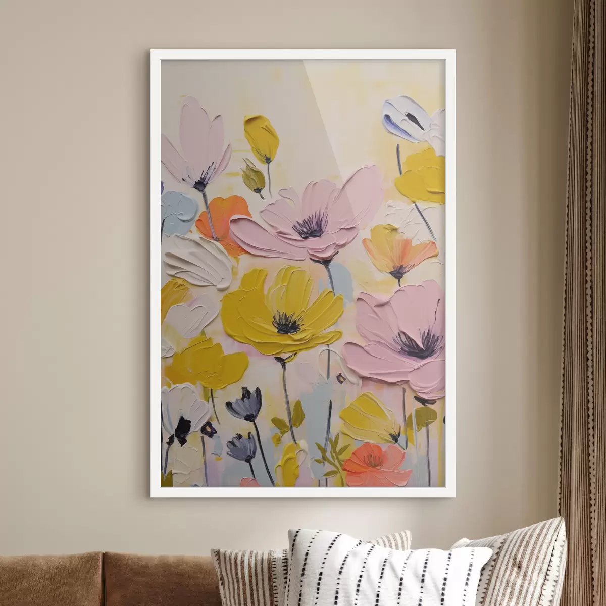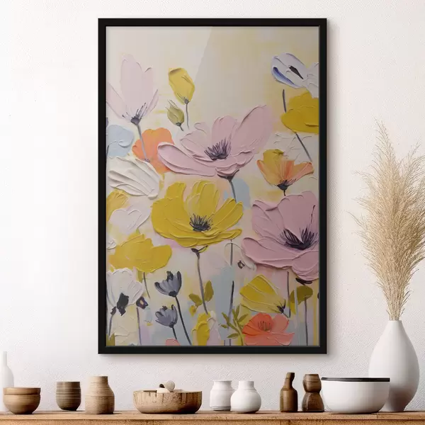 Plakatas Laukinės gėlės pastelinės spalvos, teptuko potėpių imitacija, geltona, alyvinė, smėlio, mėlyna spalvos Ne f40488