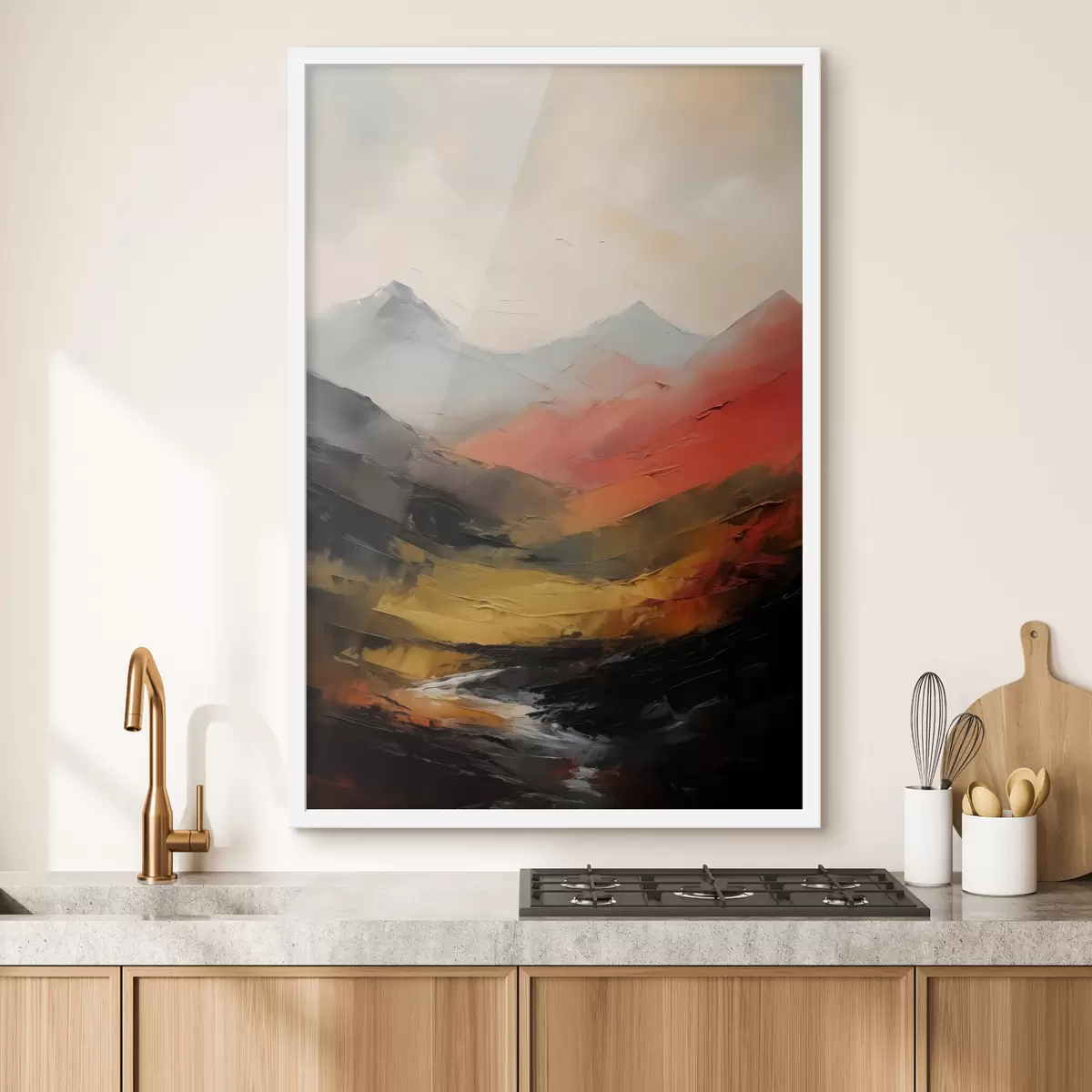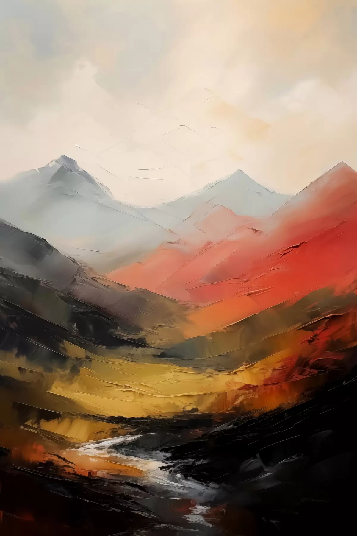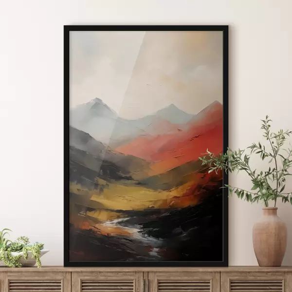 Plakatas Šviesūs kalnai, debesuotas dangus, teptuko potėpių imitacija, raudona, geltona, mėlyna, juoda spalva f40491