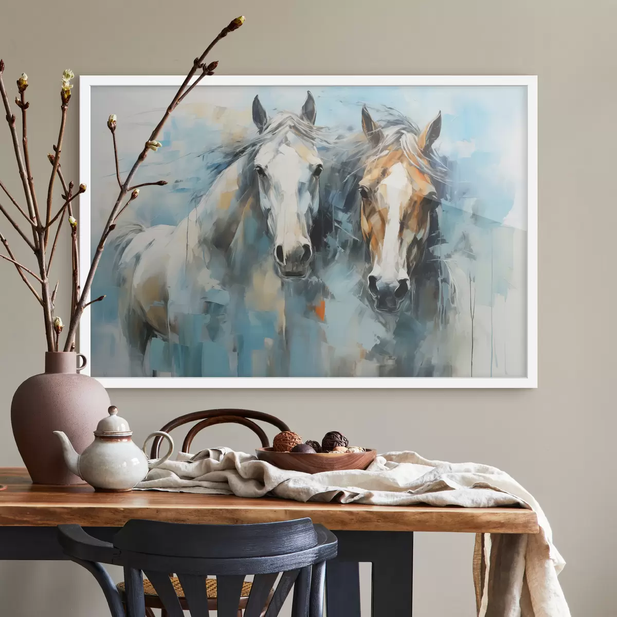 Plakatas Arkliai abstrakti tapyba, balta, mėlyna, ruda spalva Ne f40493