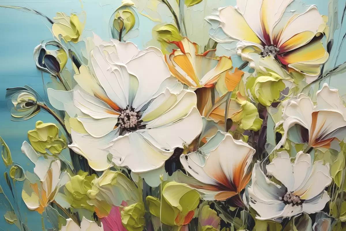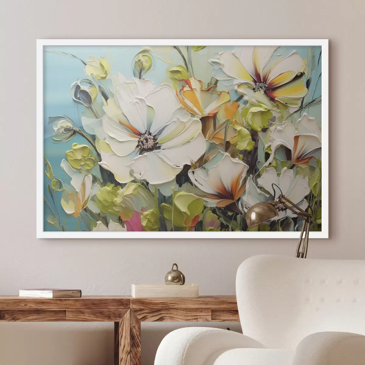 Plakatas Baltų gėlių puokštė lapijoje, dažų potėpių imitacija, žalia, mėlyna, balta spalva Ne f40496
