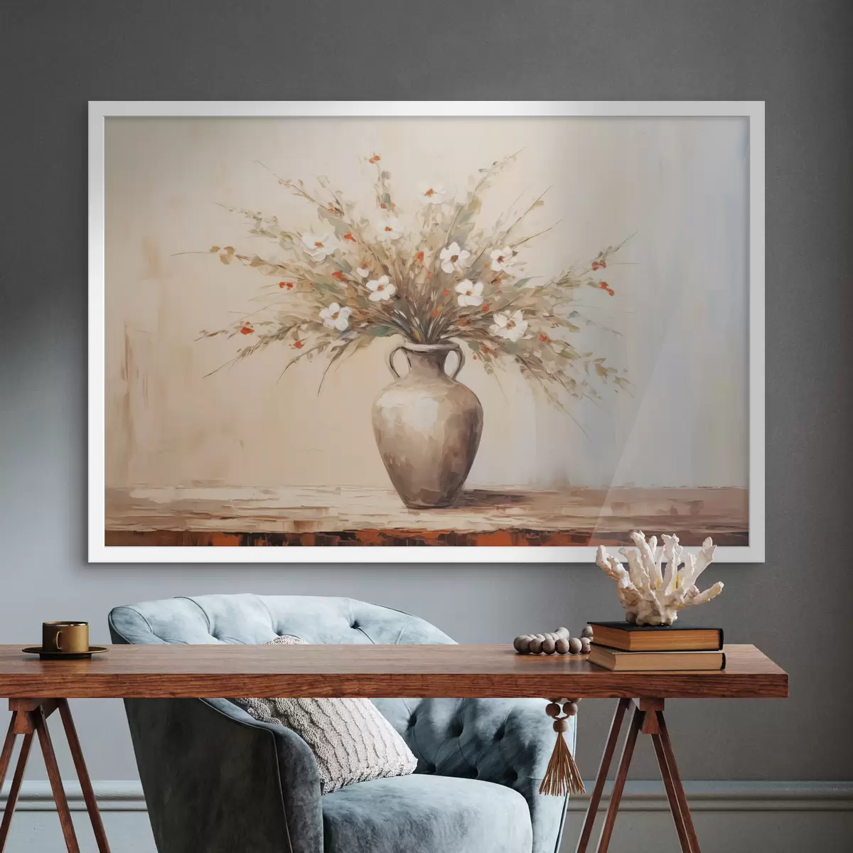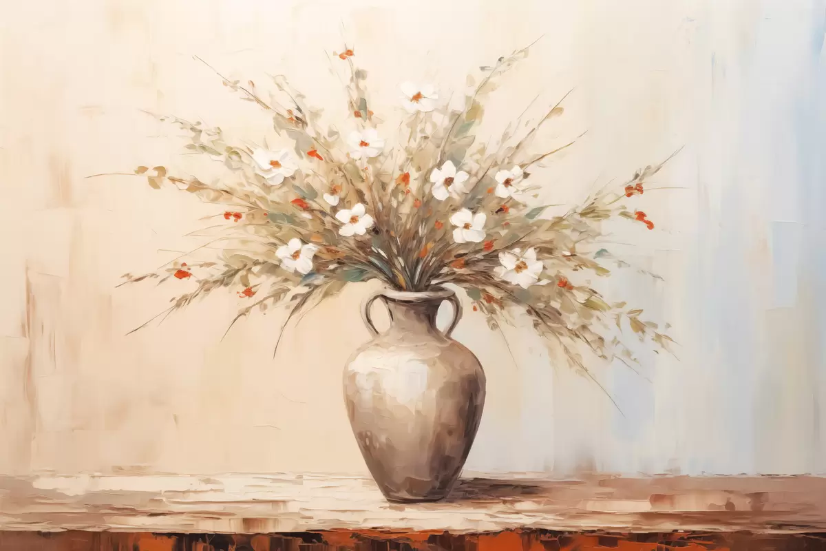 Plakatas Subtili baltų gėlių ir šakelių puokštė senovinėje vazoje f40497