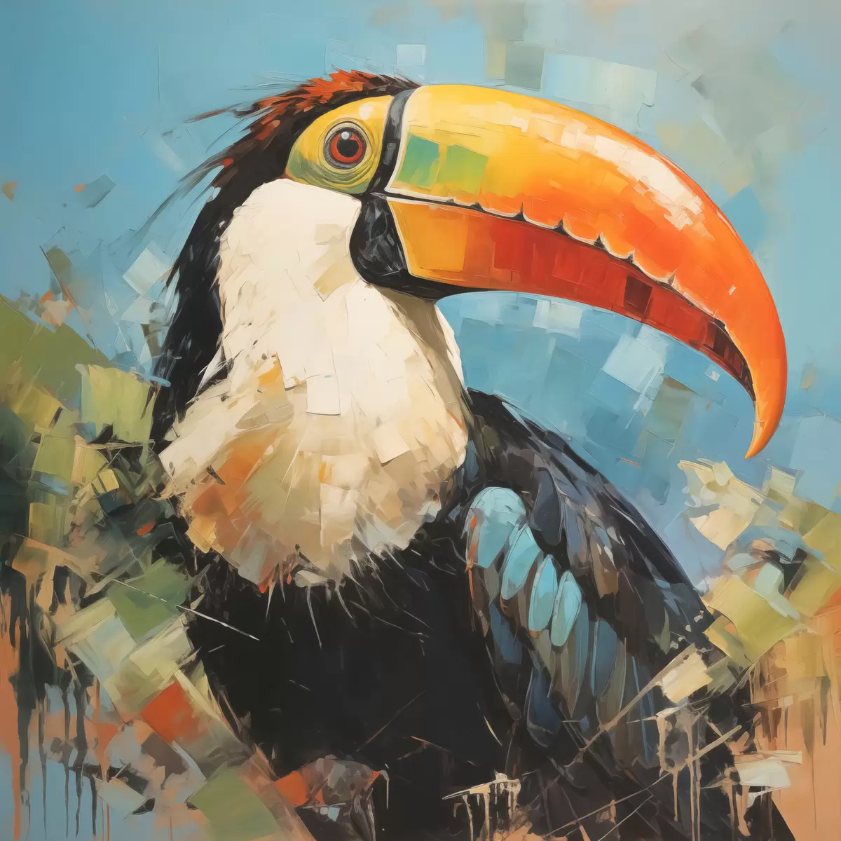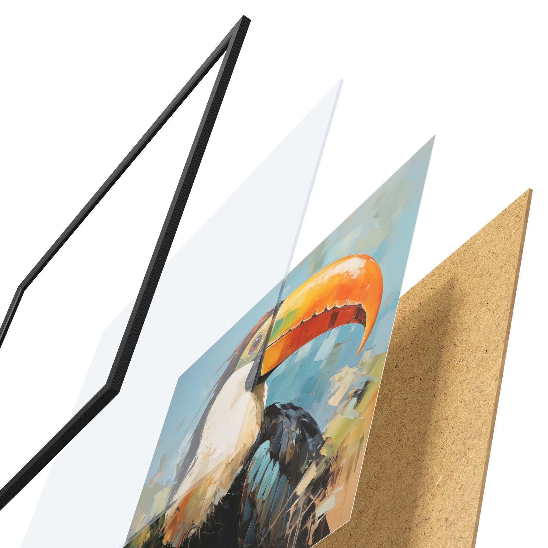 Plakatas Tukanų paukštis mėlyname žaliame fone, teptuko potėpių imitacija Ne f40498