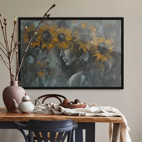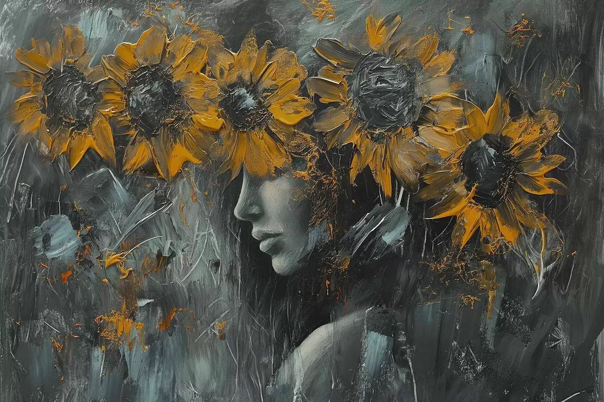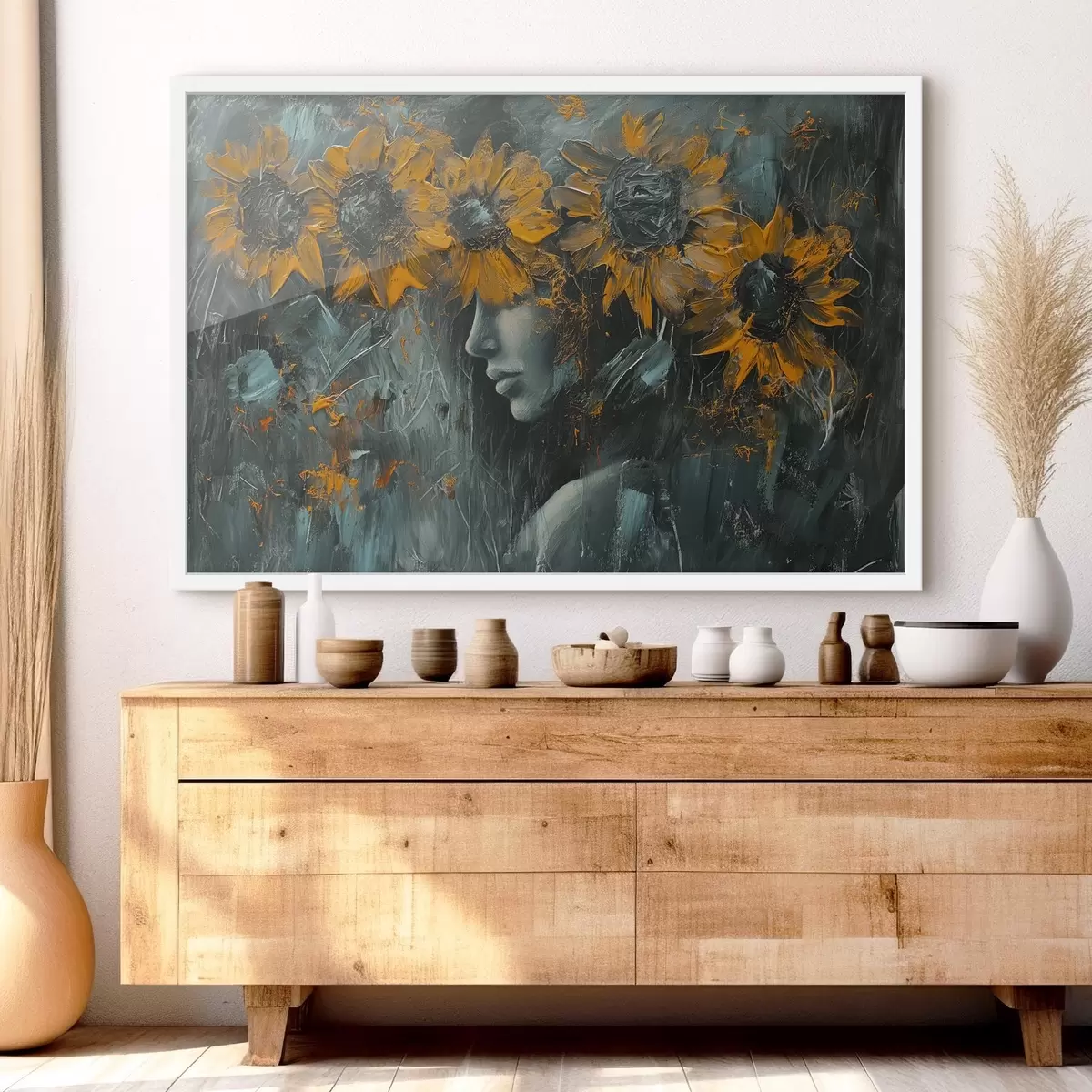 Plakatas Abstrakčios saulėgrąžos, dengiančios mergaitės veidą Ne f40501