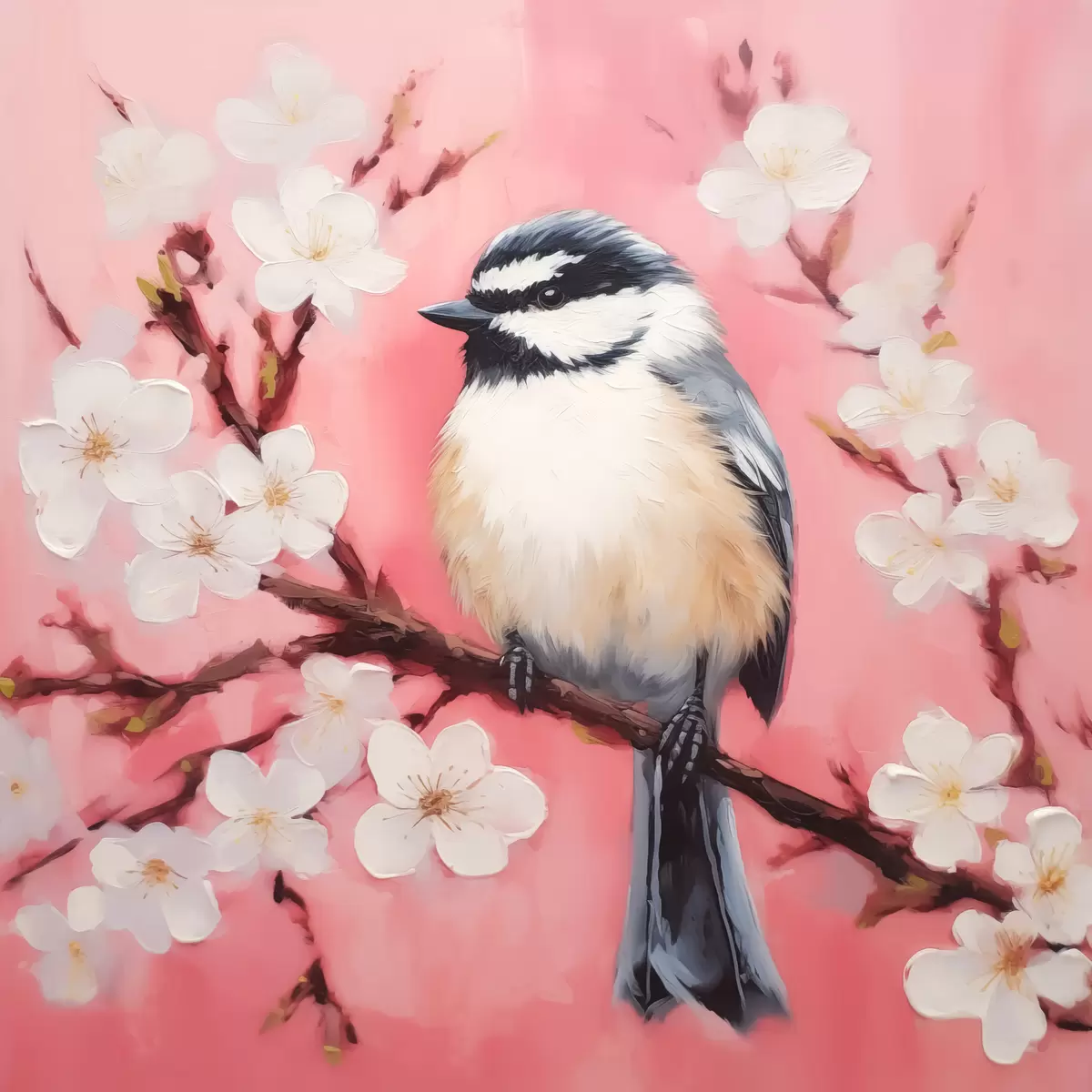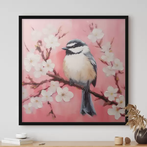 Plakatas Paukštis sėdi ant šakos su baltomis gėlėmis rožiniame fone f40517