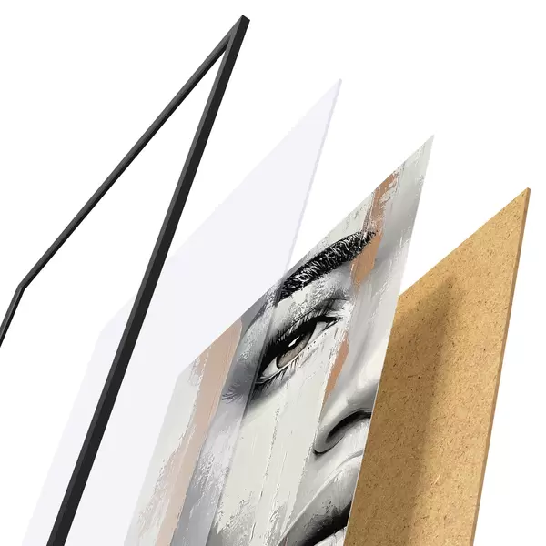 Plakatą sudaro rėmas, pleksiklas, atspausdintas vaizdas ir medžio drožlių plokštės pagrindas. Plakatą galima iš karto pakabinti ant sienos dėl kitoje pusėje esančių laikiklių.