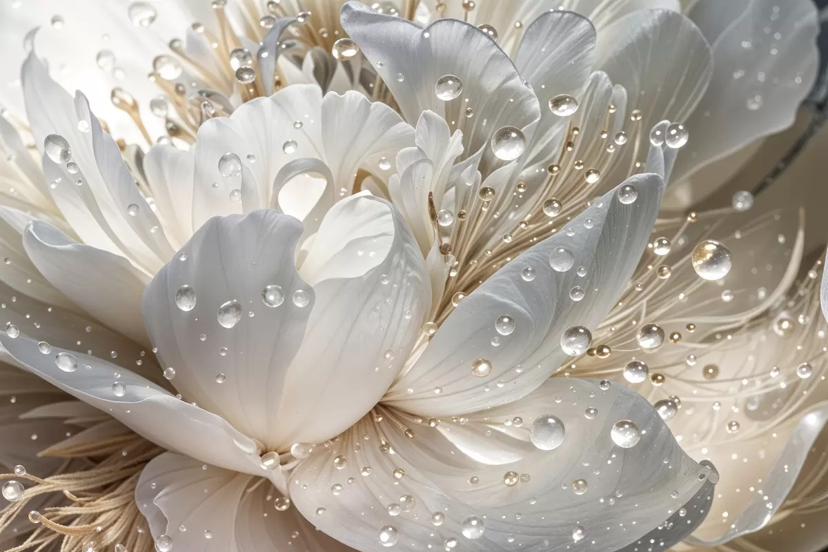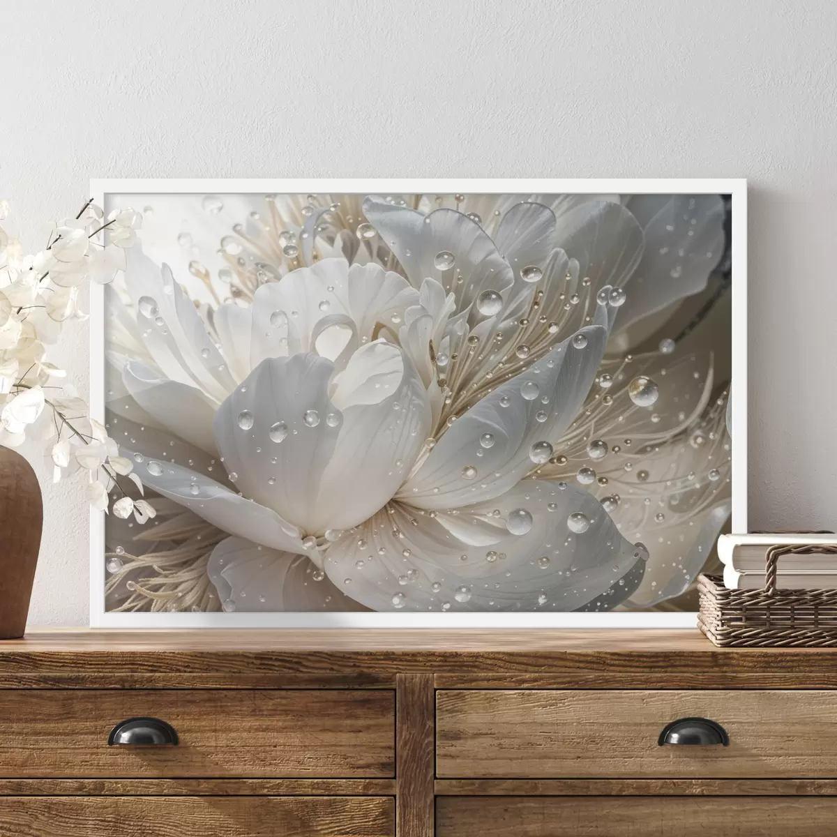 Plakatas Iš arti balta bijūno gėlė su vandens lašeliais ant žiedlapių, neryškiame fone f40539