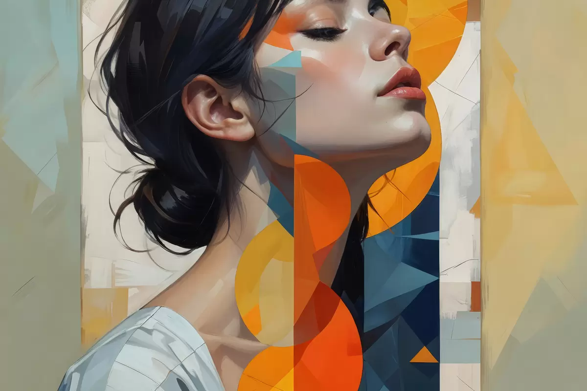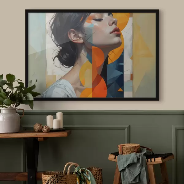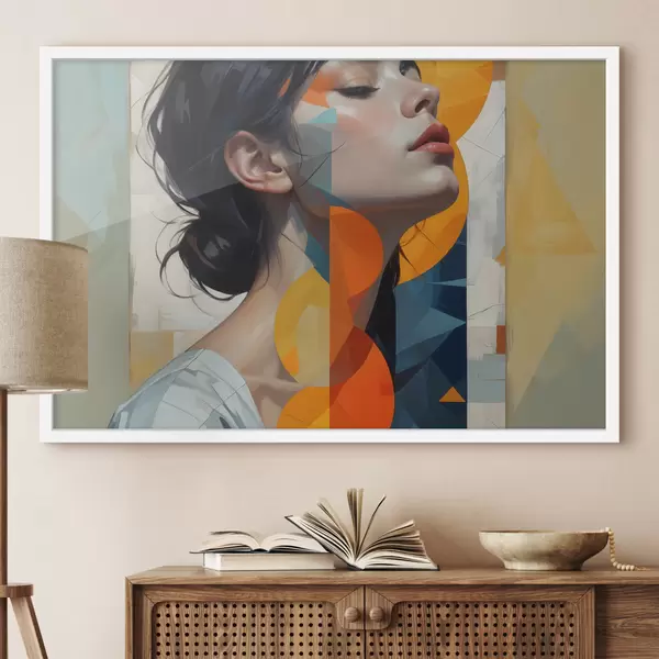 Plakatas Abstraktus paveikslas, kuriame moteris ilgais tamsiais plaukais vilki baltais marškiniais su spalvingu geometriniu raštu Ne f40543