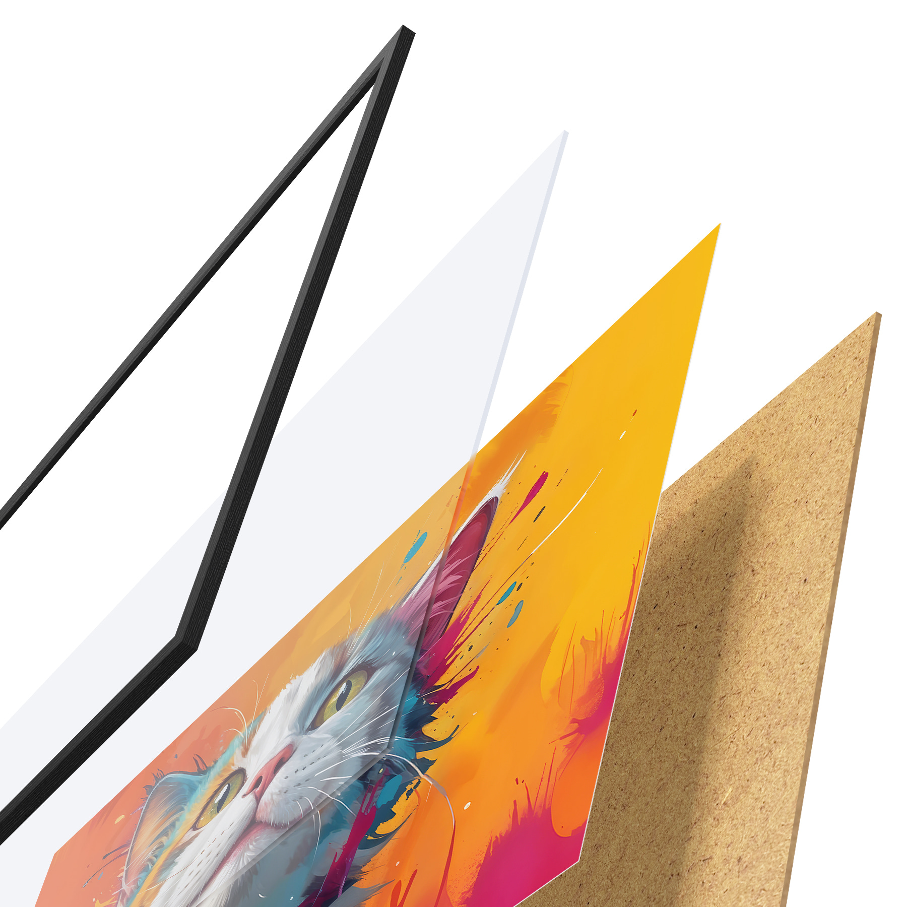 Plakatas Baltos ir oranžinės spalvos katės portretas iš arti su ryškiais, spalvingais dažų purslais Ne f40547