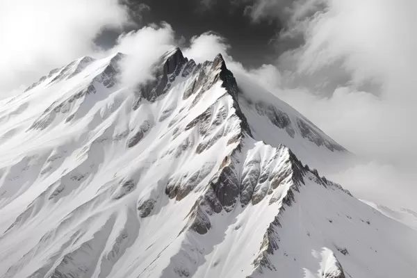 Plakatas Snieguotos juodai baltos kalnų viršūnės drumstame, dramatiškame kraštovaizdyje f40553