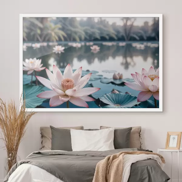 Plakatas Tvenkinys, kurio paviršiuje plūduriuoja rožinės spalvos lotoso žiedai, apsuptas vešlios žalumos ir palmių f40555