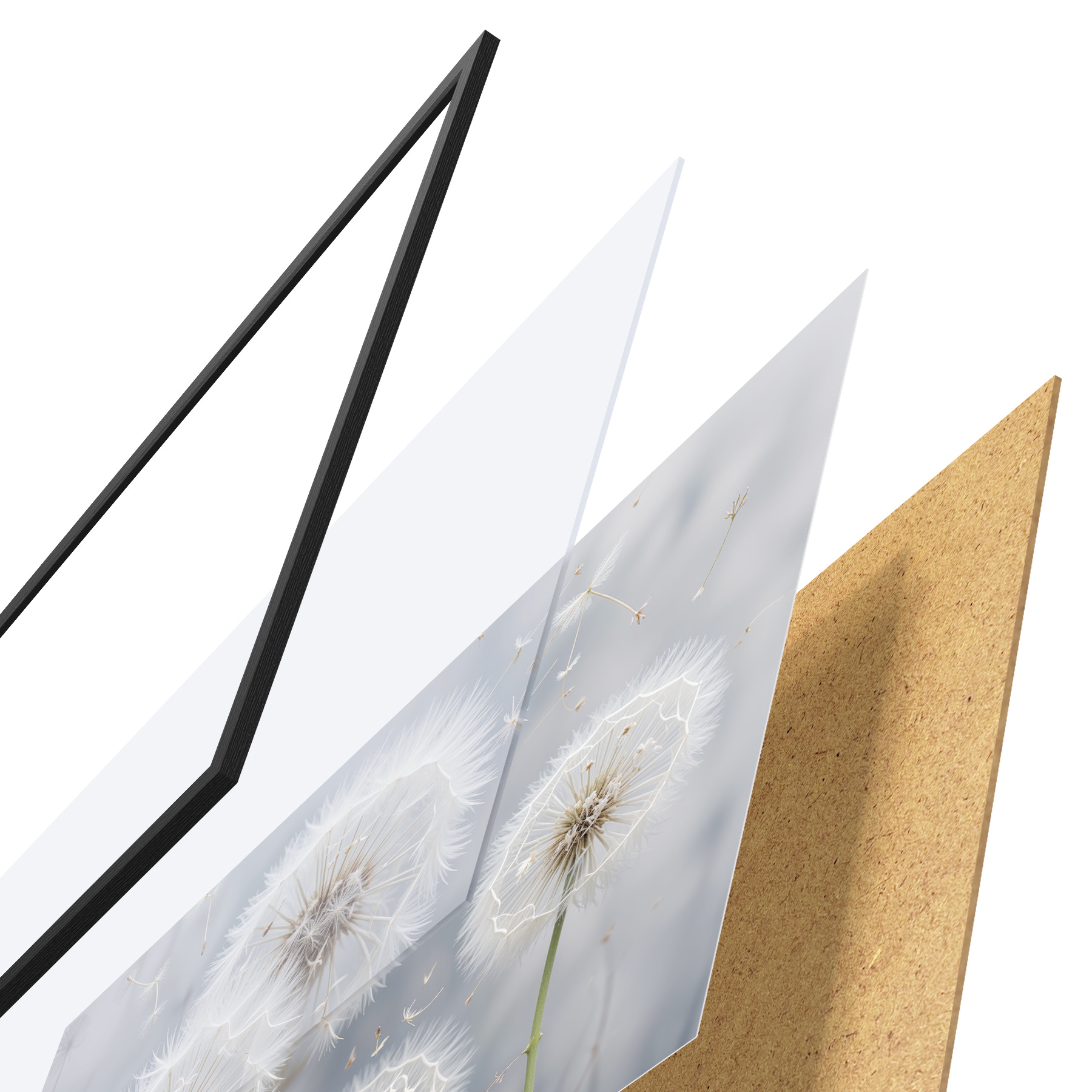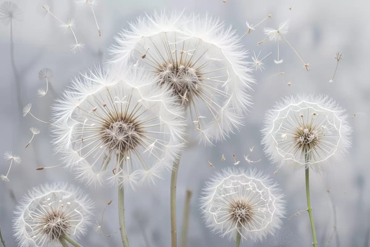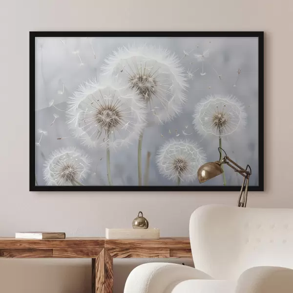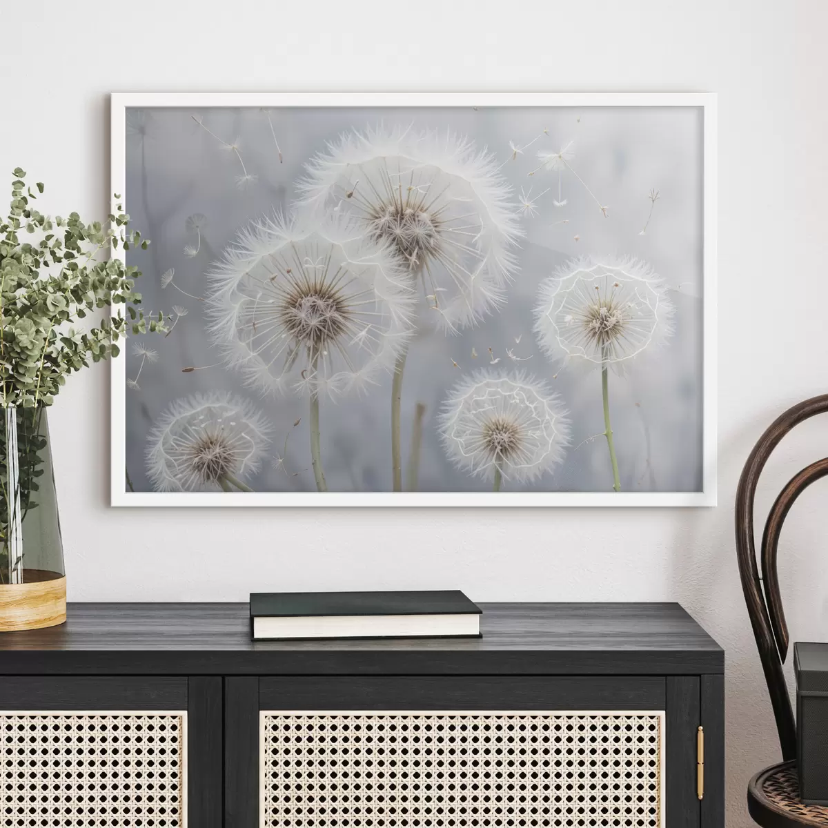 Plakatas Baltos kiaulpienės žiedai su puriomis sėklomis neryškiame pilkame fone f40556