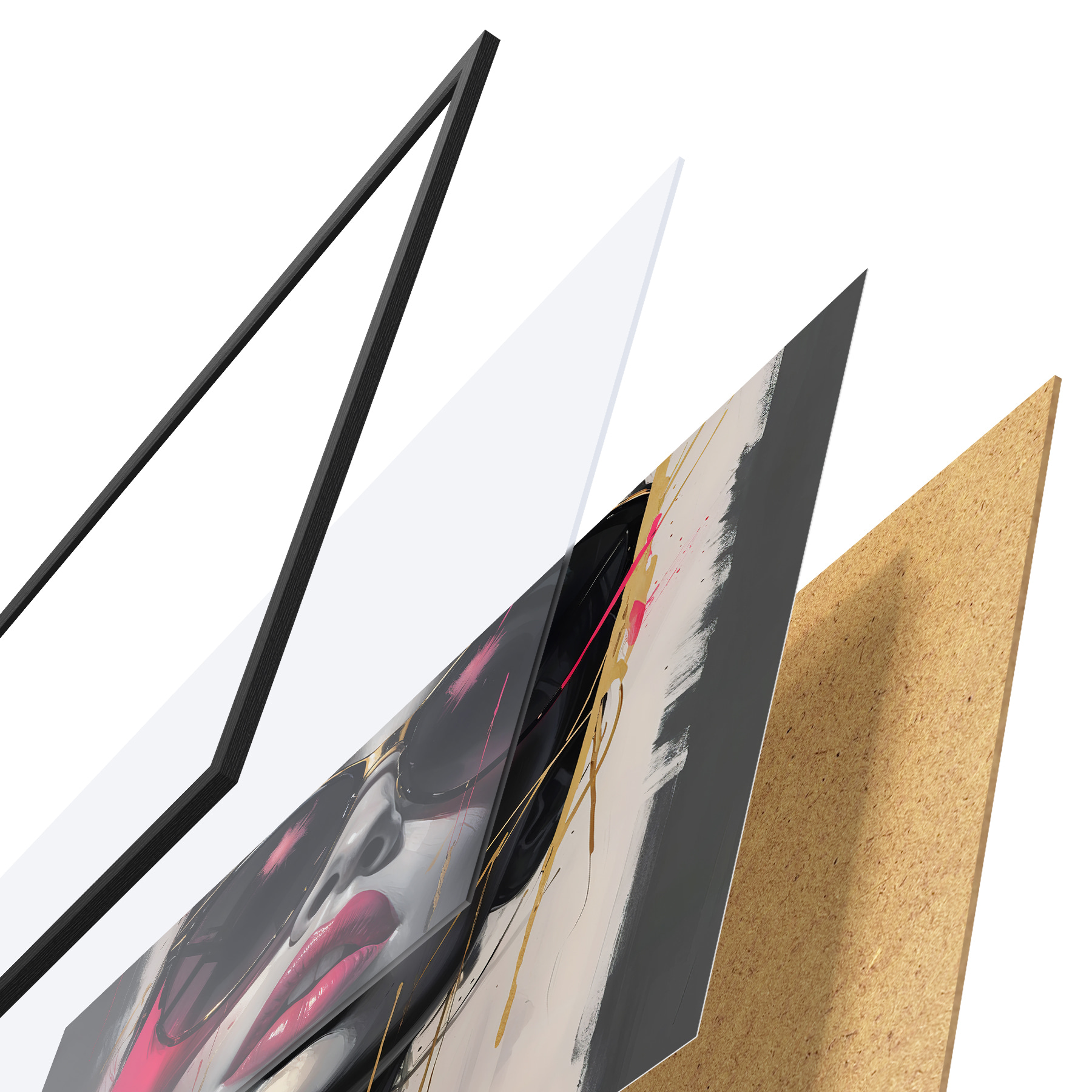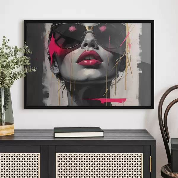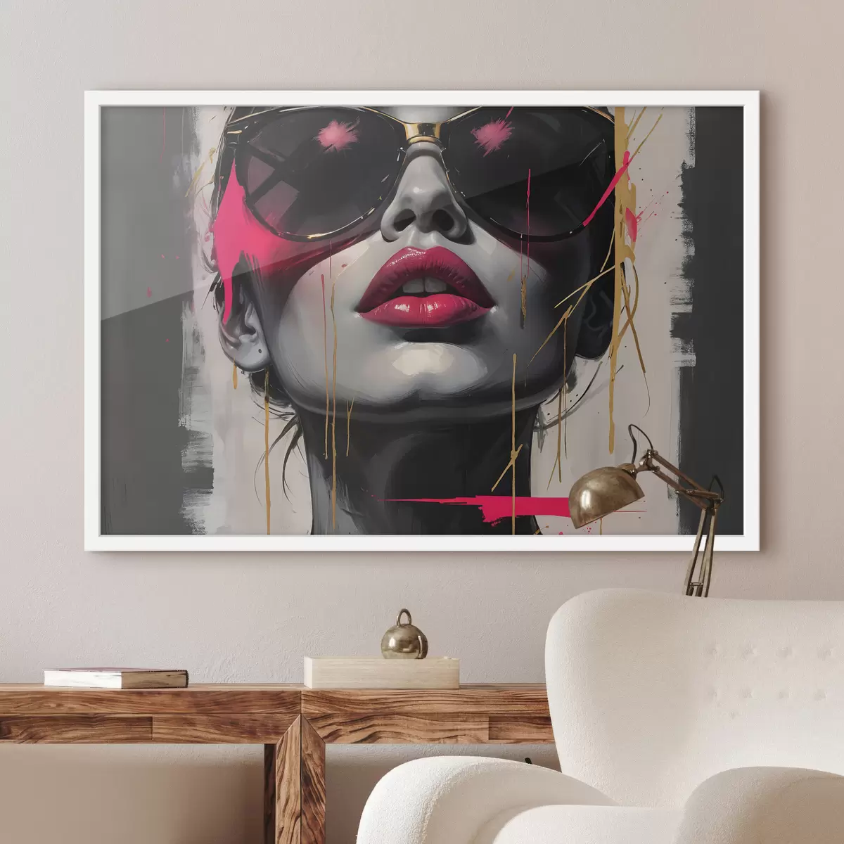 Plakatas Abstraktus jaunos moters su akiniais nuo saulės portretas su rausvomis lūpomis ir abstrakčiomis formomis bei rausvos spalvos purslais f40558