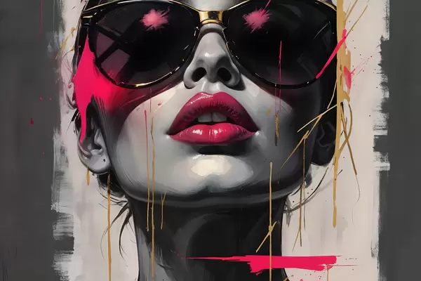 Plakatas Abstraktus jaunos moters su akiniais nuo saulės portretas su rausvomis lūpomis ir abstrakčiomis formomis bei rausvos spalvos purslais f40558
