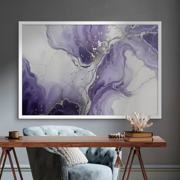 Plakatas Abstraktus skystas meno kompozicijos spaudinys su besisukančiomis purpuriniu, baltu ir pilku rašalu f40566