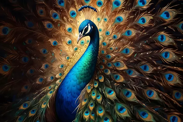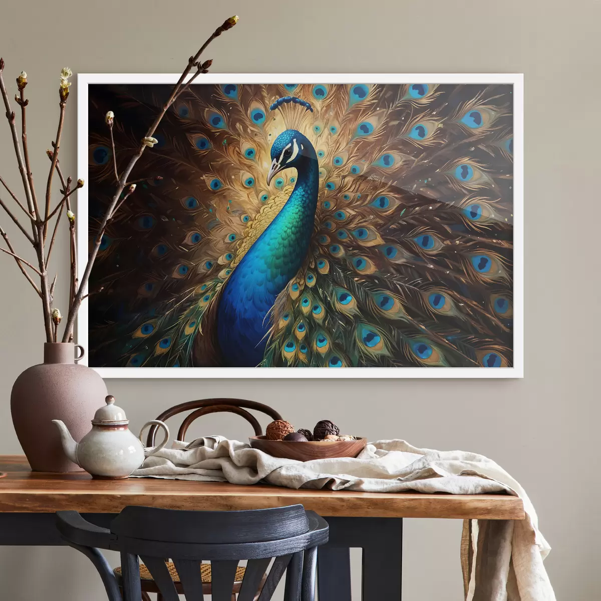Plakatas Ryškus povas, kurio plunksnos yra visiškai iškabintos, demonstruojantis nuostabią mėlyną, žalią plunksną f40571