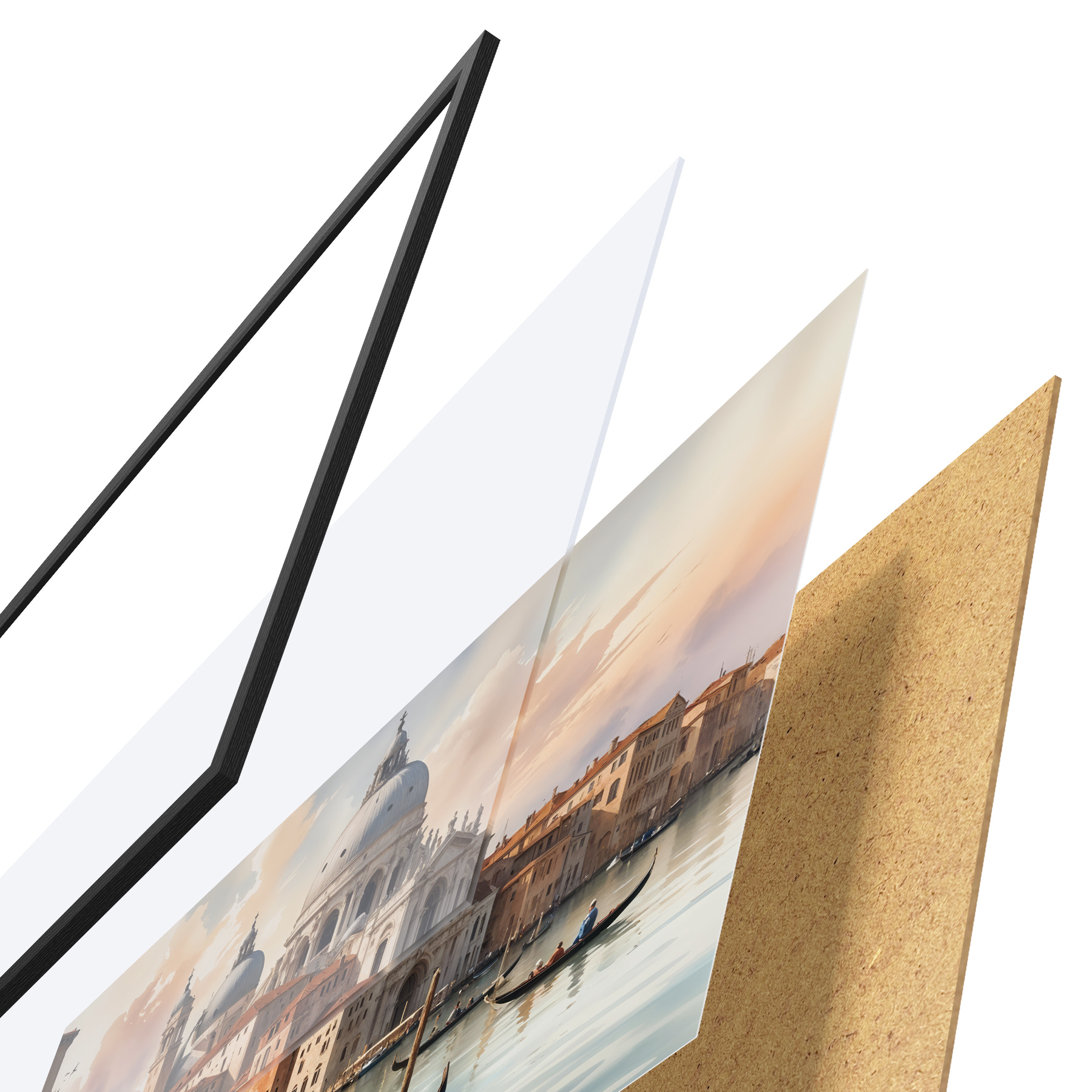 Plakatą sudaro rėmas, pleksiklas, atspausdintas vaizdas ir medžio drožlių plokštės pagrindas. Plakatą galima iš karto pakabinti ant sienos dėl kitoje pusėje esančių laikiklių.