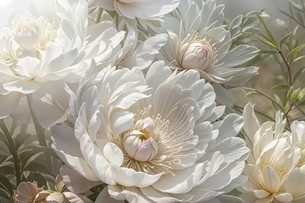 Plakatas Kelių didelių, baltų bijūnų gėlių stambiu planu su švelniais, švelniais žiedlapiais ir šviesiai geltonais centrais f40575