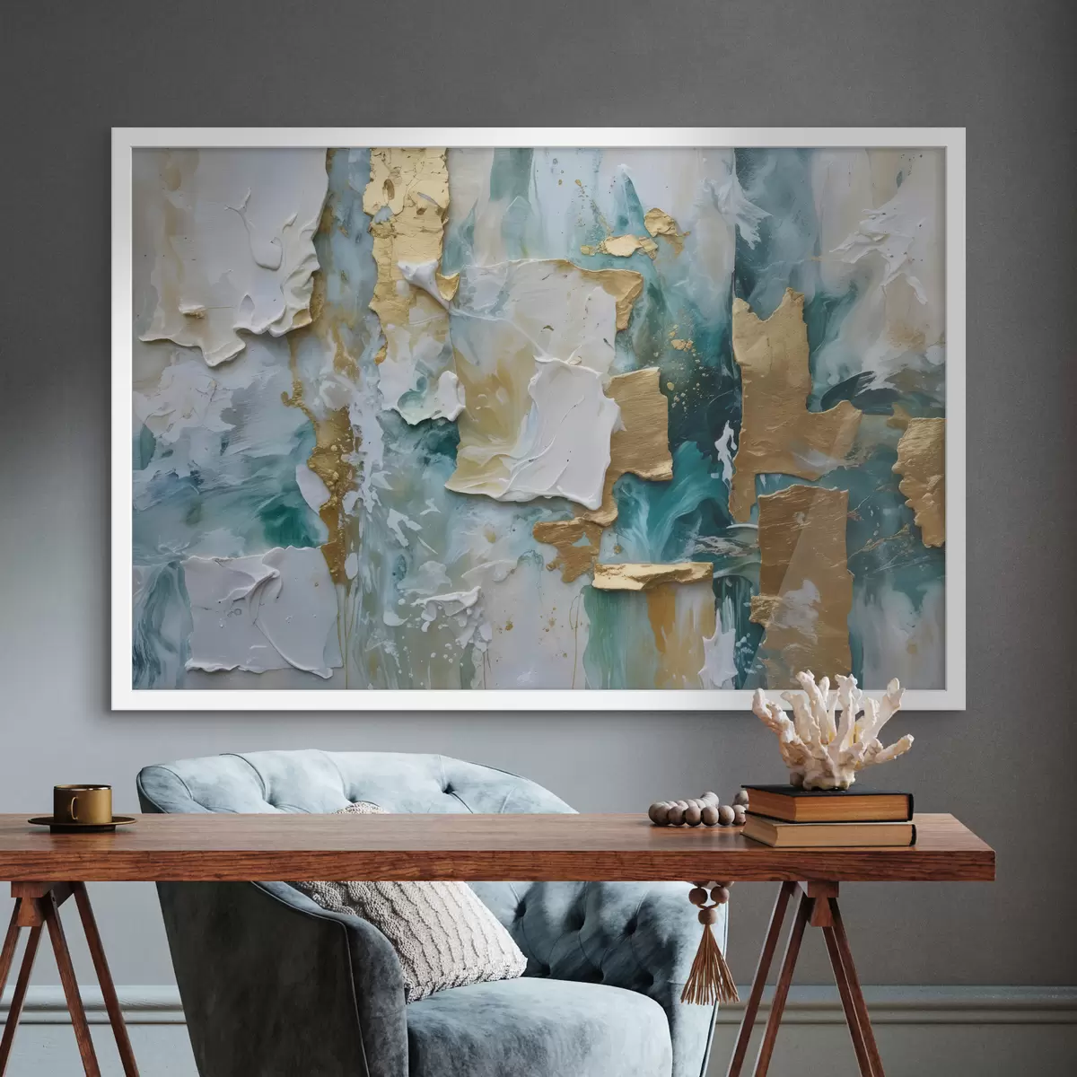Plakatas Nulupami dažai su baltos, mėlynos ir geltonos spalvos sluoksniais, sukuriantys abstraktų, tekstūruotą spaudinį f40577