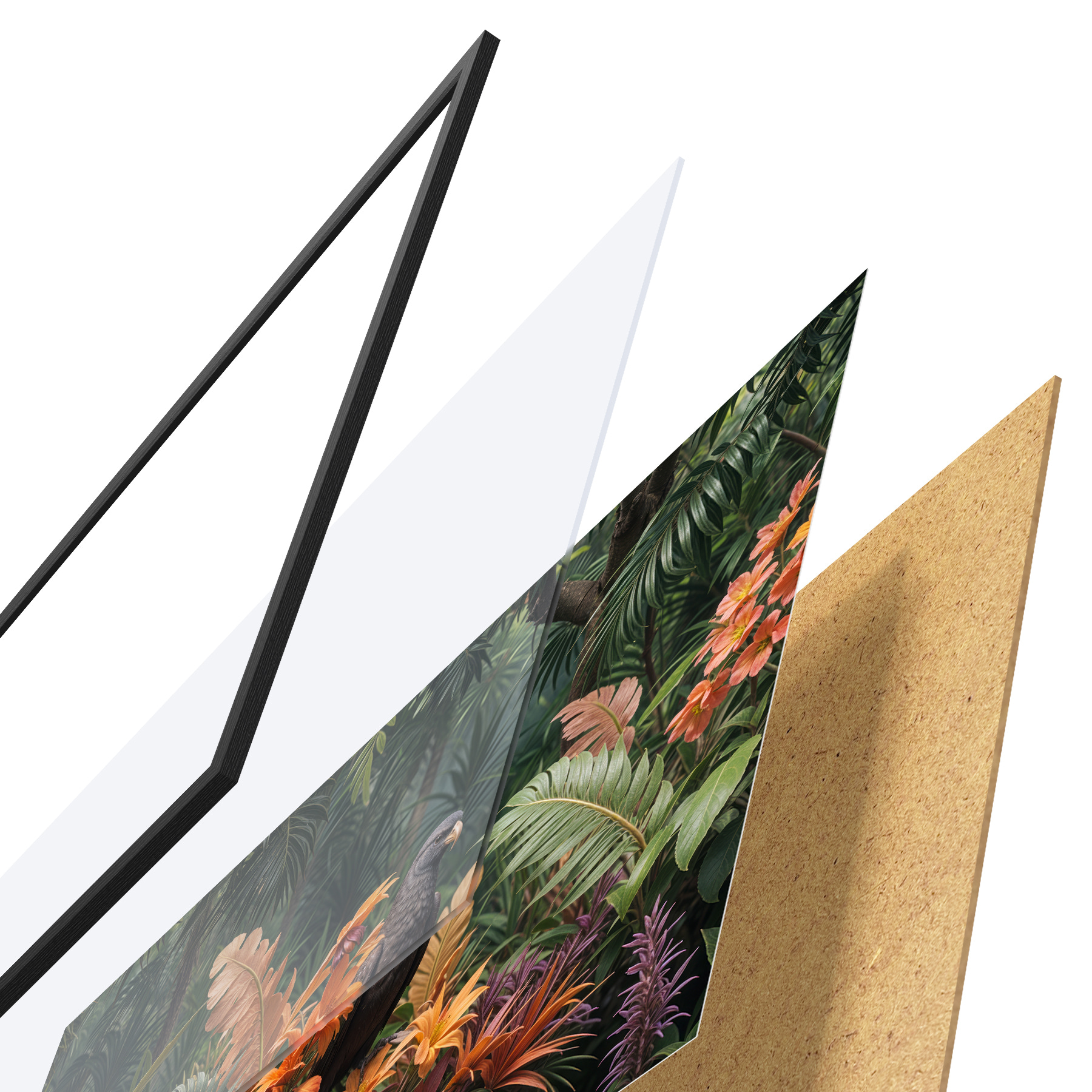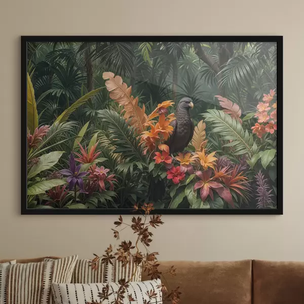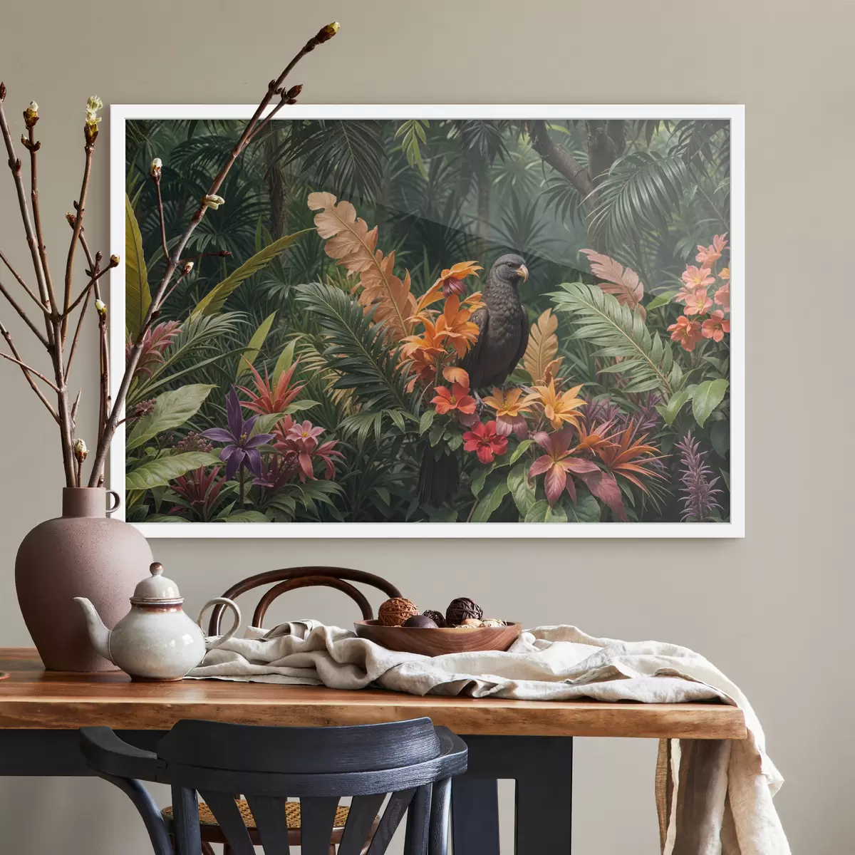 Plakatas Atogrąžų paukštis, tupintis ant šakos, apsuptas ryškių lapų, palmių lapų, gėlių ir egzotiškų augalų f40578