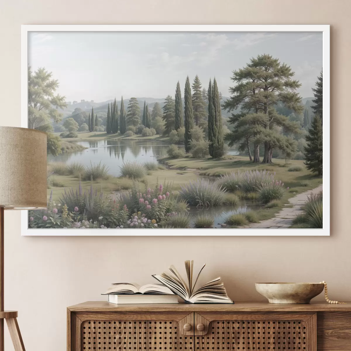 Plakatas Ramus kraštovaizdis su ramiu ežeru, apsuptu pušų, kiparisų ir kitos vešlios augmenijos Ne f40579
