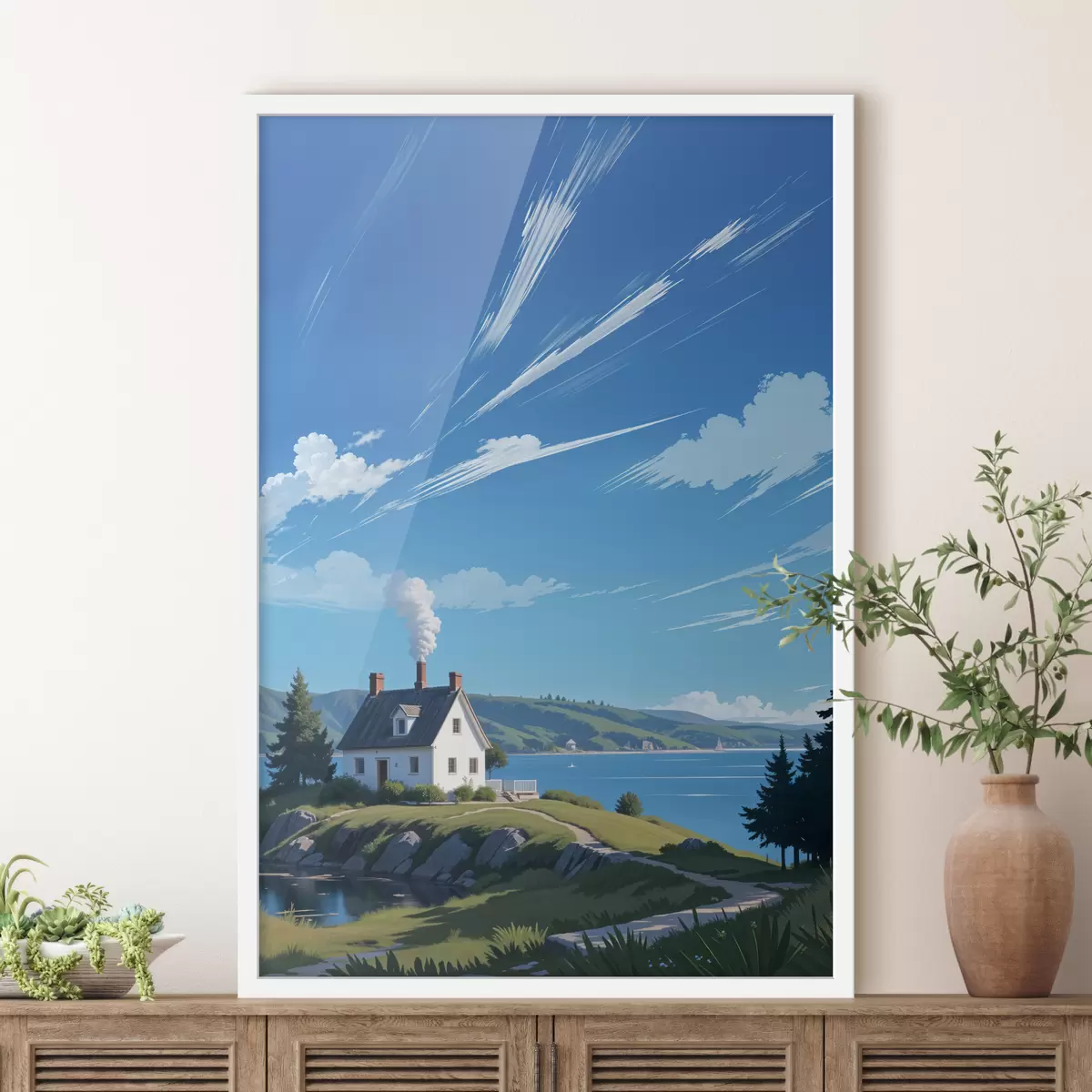 Plakatas Baltas namas ant žole apaugusios kalvos su kalnais fone ir mėlynu dangumi su debesimis f40587