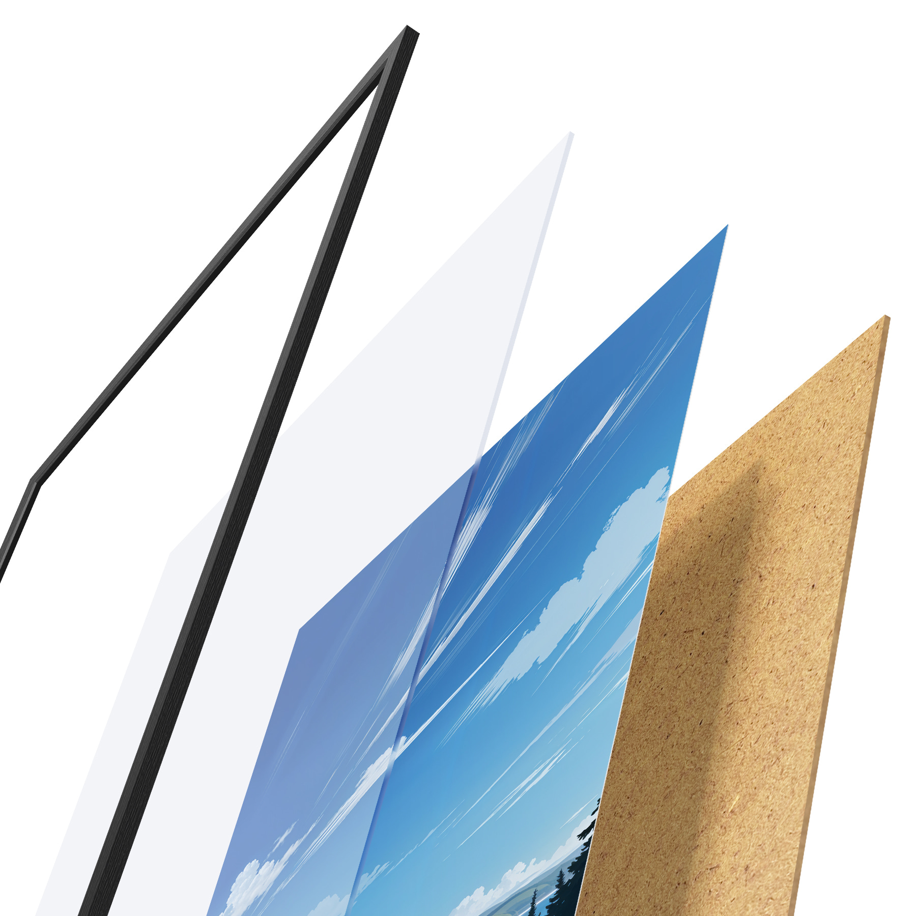 Plakatą sudaro rėmas, pleksiklas, atspausdintas vaizdas ir medžio drožlių plokštės pagrindas. Plakatą galima iš karto pakabinti ant sienos dėl kitoje pusėje esančių laikiklių.