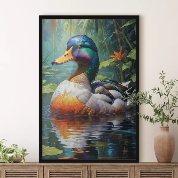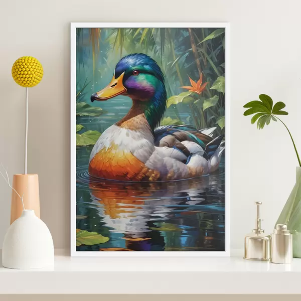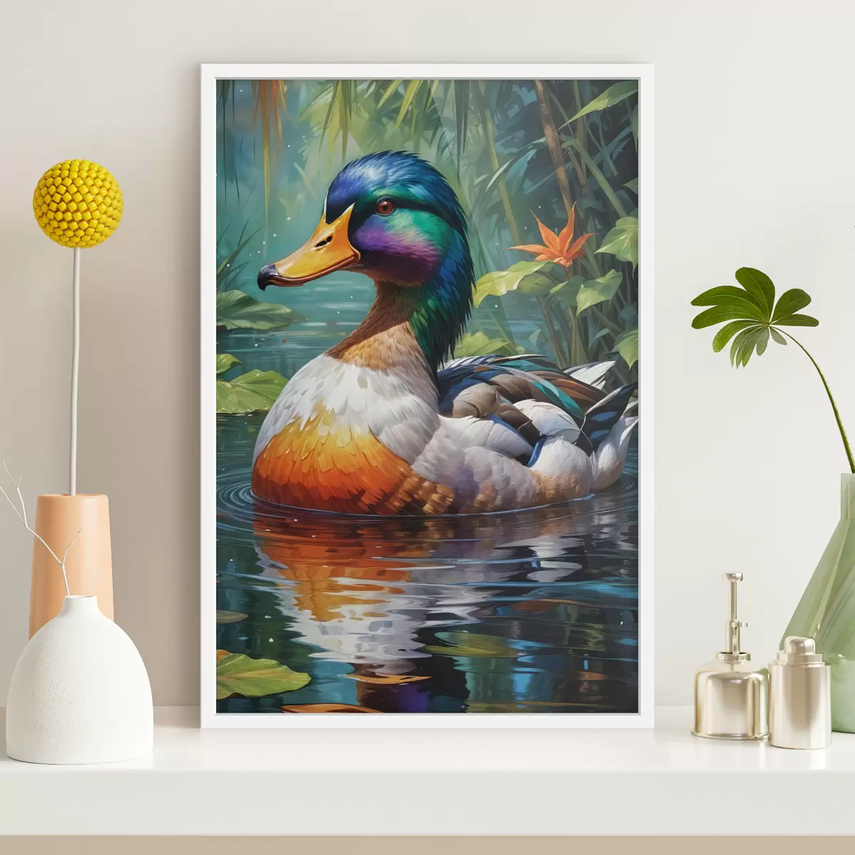 Plakatas Spalvingas mandarininės anties patinas, plaukiojantis tvenkinyje su vešlia žalia lapija ir nukritusiais rudens lapais f40594