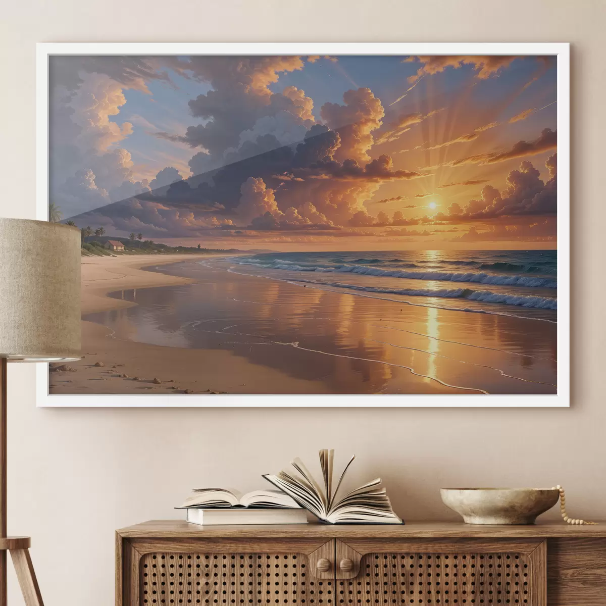 Plakatas Dramatiškas saulėlydis virš atogrąžų paplūdimio su ryškiais oranžiniais ir rausvais debesimis, atsispindinčiais ramiame vandenyje f40599