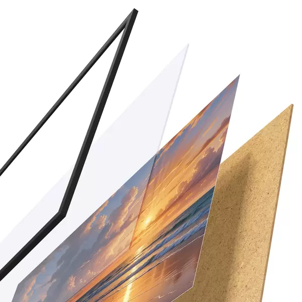 Plakatą sudaro rėmas, pleksiklas, atspausdintas vaizdas ir medžio drožlių plokštės pagrindas. Plakatą galima iš karto pakabinti ant sienos dėl kitoje pusėje esančių laikiklių.