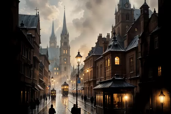 Plakatas Lietingas vakaras sename Europos mieste su grindinio gatvėmis, istoriniais pastatais ir pravažiuojančiu tramvajumi f40604
