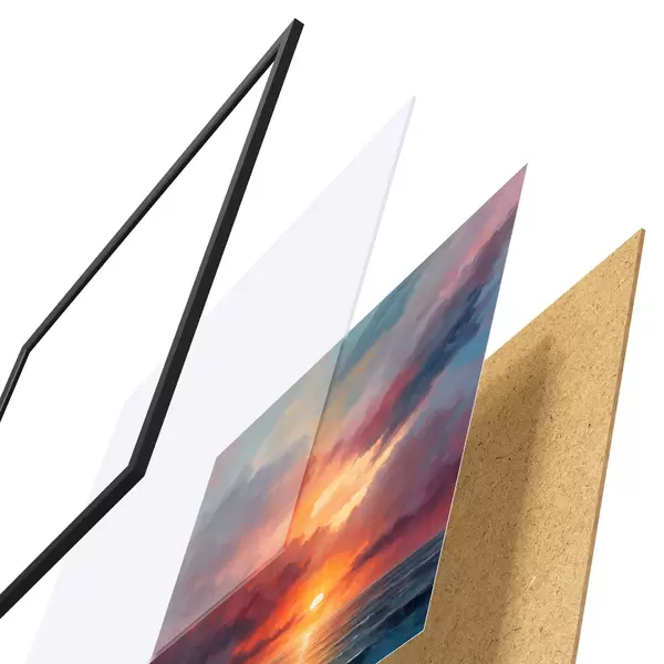 Plakatą sudaro rėmas, pleksiklas, atspausdintas vaizdas ir medžio drožlių plokštės pagrindas. Plakatą galima iš karto pakabinti ant sienos dėl kitoje pusėje esančių laikiklių.