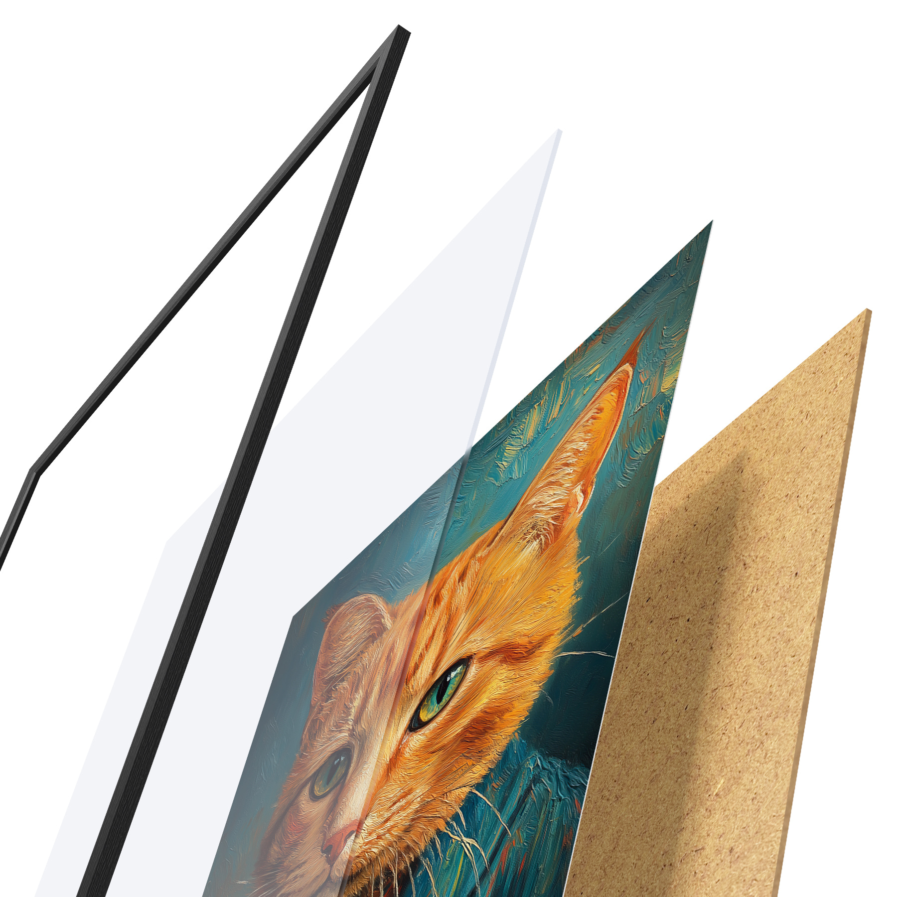 Plakatą sudaro rėmas, pleksiklas, atspausdintas vaizdas ir medžio drožlių plokštės pagrindas. Plakatą galima iš karto pakabinti ant sienos dėl kitoje pusėje esančių laikiklių.