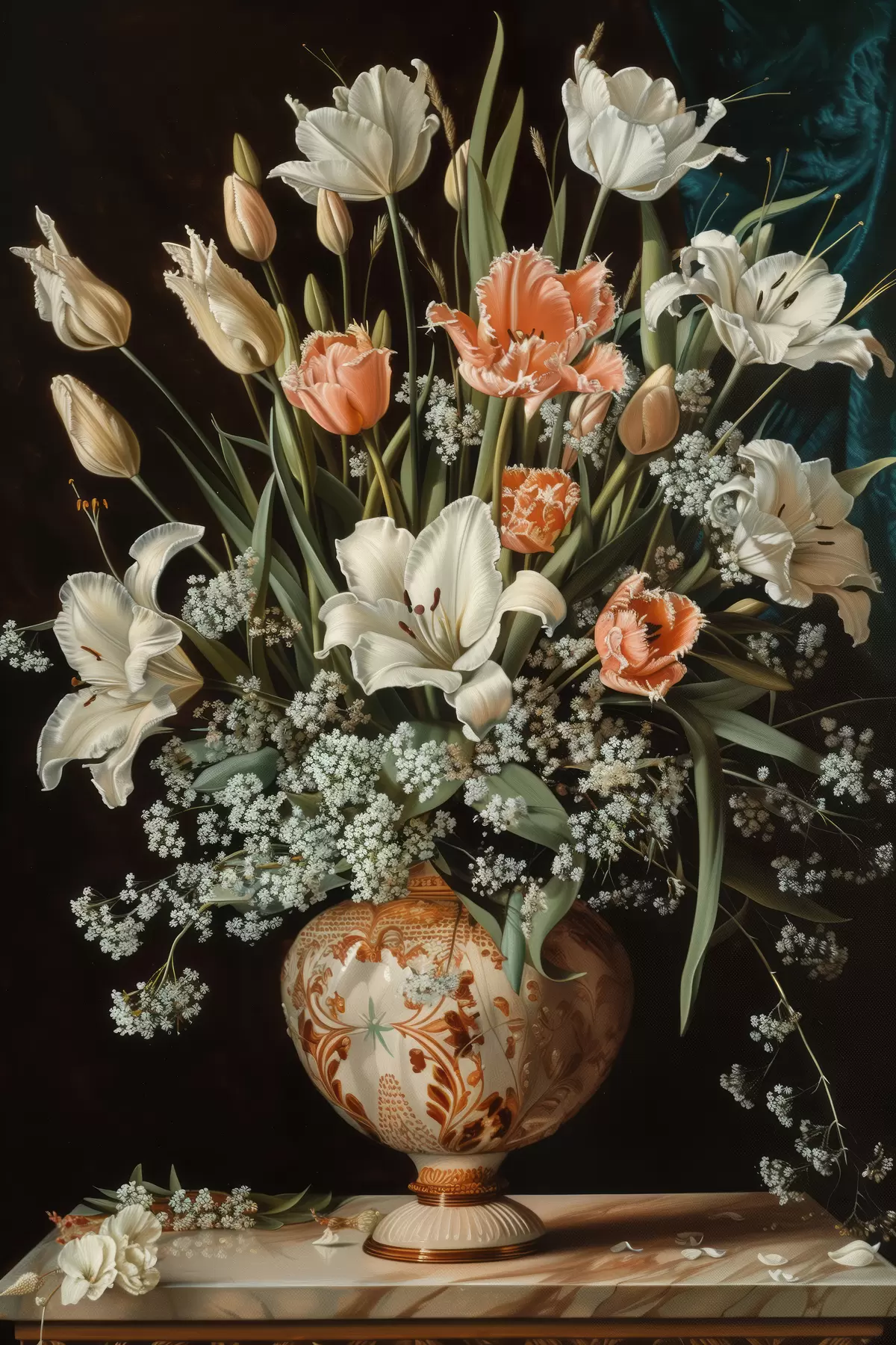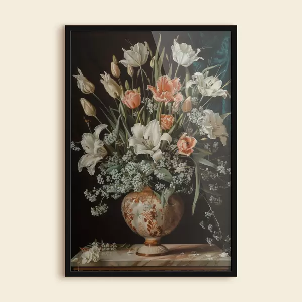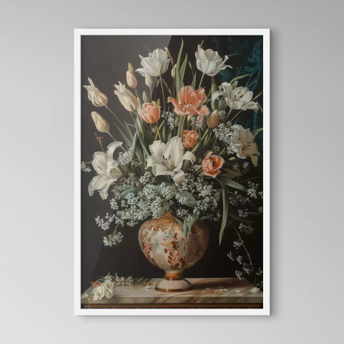 Plakatas Ekstravagantiškas barokinis natiurmortas su vaza, perpildyta tulpėmis, gvazdikais ir hiacintais, aliejinės tapybos imitacija f40658