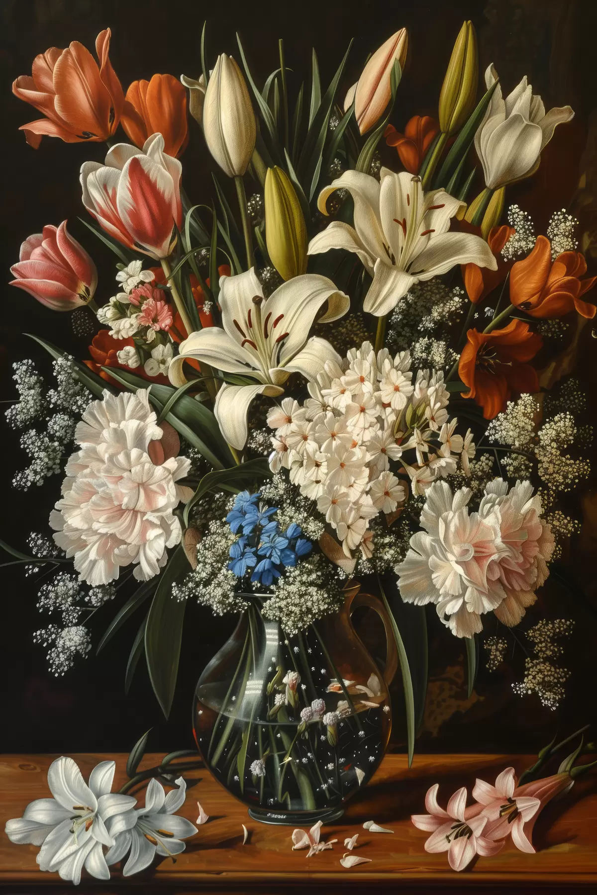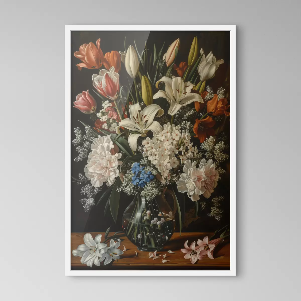 Plakatas Barokinis natiurmortas su vaza, perpildyta tulpių, gvazdikų ir hiacintų, aliejinės tapybos imitacija Ne f40659