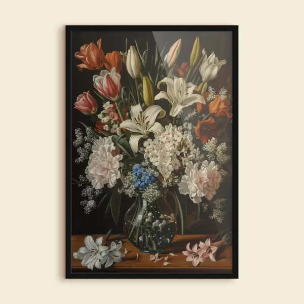 Plakatas Barokinis natiurmortas su vaza, perpildyta tulpių, gvazdikų ir hiacintų, aliejinės tapybos imitacija f40659
