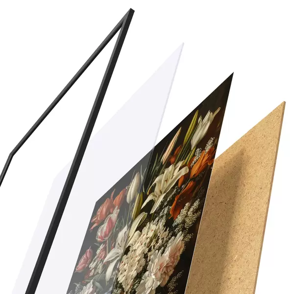 Plakatą sudaro rėmas, pleksiklas, atspausdintas vaizdas ir medžio drožlių plokštės pagrindas. Plakatą galima iš karto pakabinti ant sienos dėl kitoje pusėje esančių laikiklių.