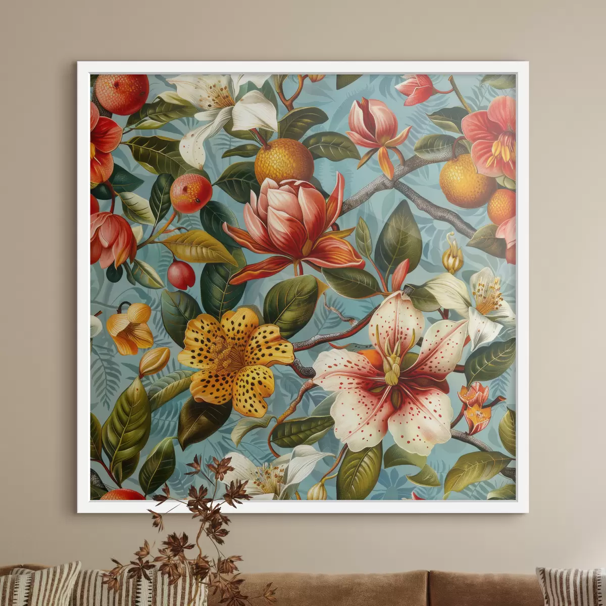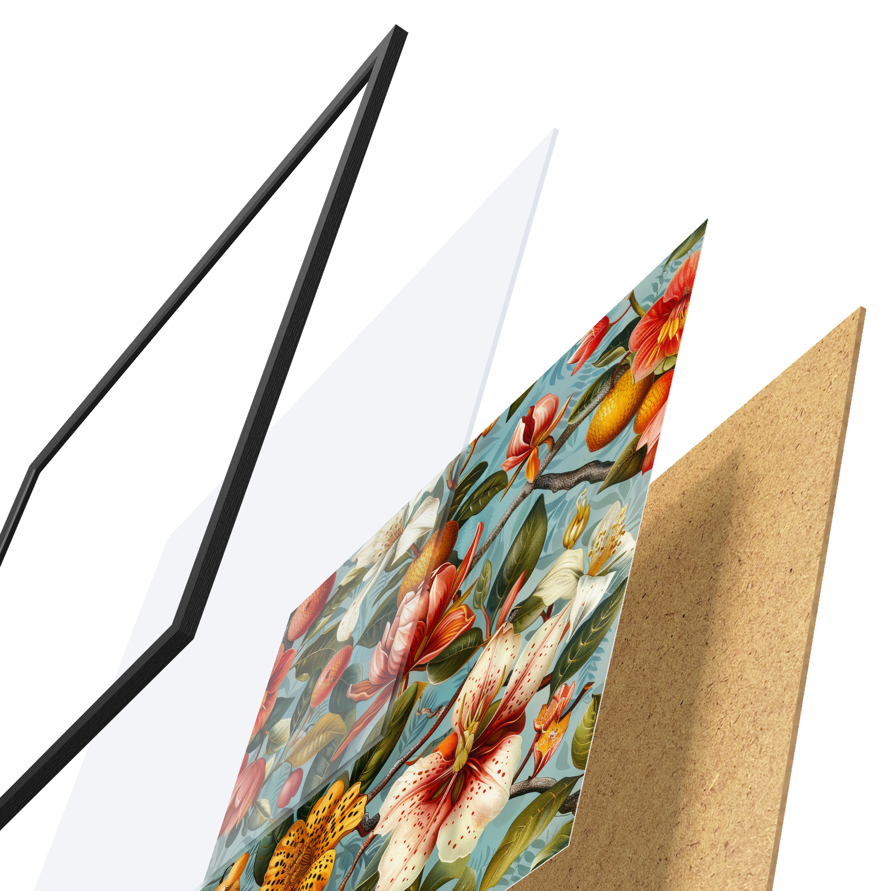 Plakatas Atogrąžų kompozicija su įvairia žaluma ir atogrąžų gėlėmis mėlyname fone Ne f40665