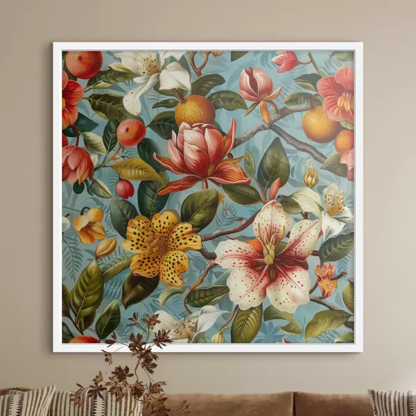 Plakatas Atogrąžų kompozicija su įvairia žaluma ir atogrąžų gėlėmis mėlyname fone f40665