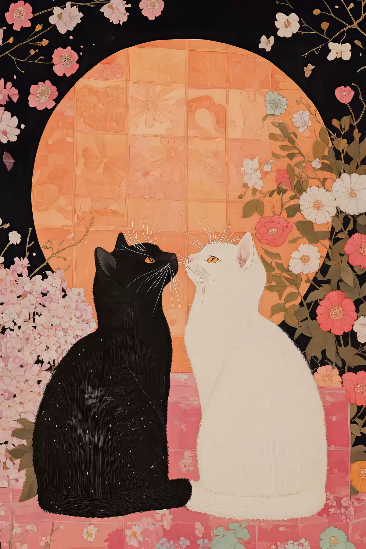 Plakatas Juoda ir balta katės, kurios saulėlydžio metu mielai žvelgia viena į kitą f40669