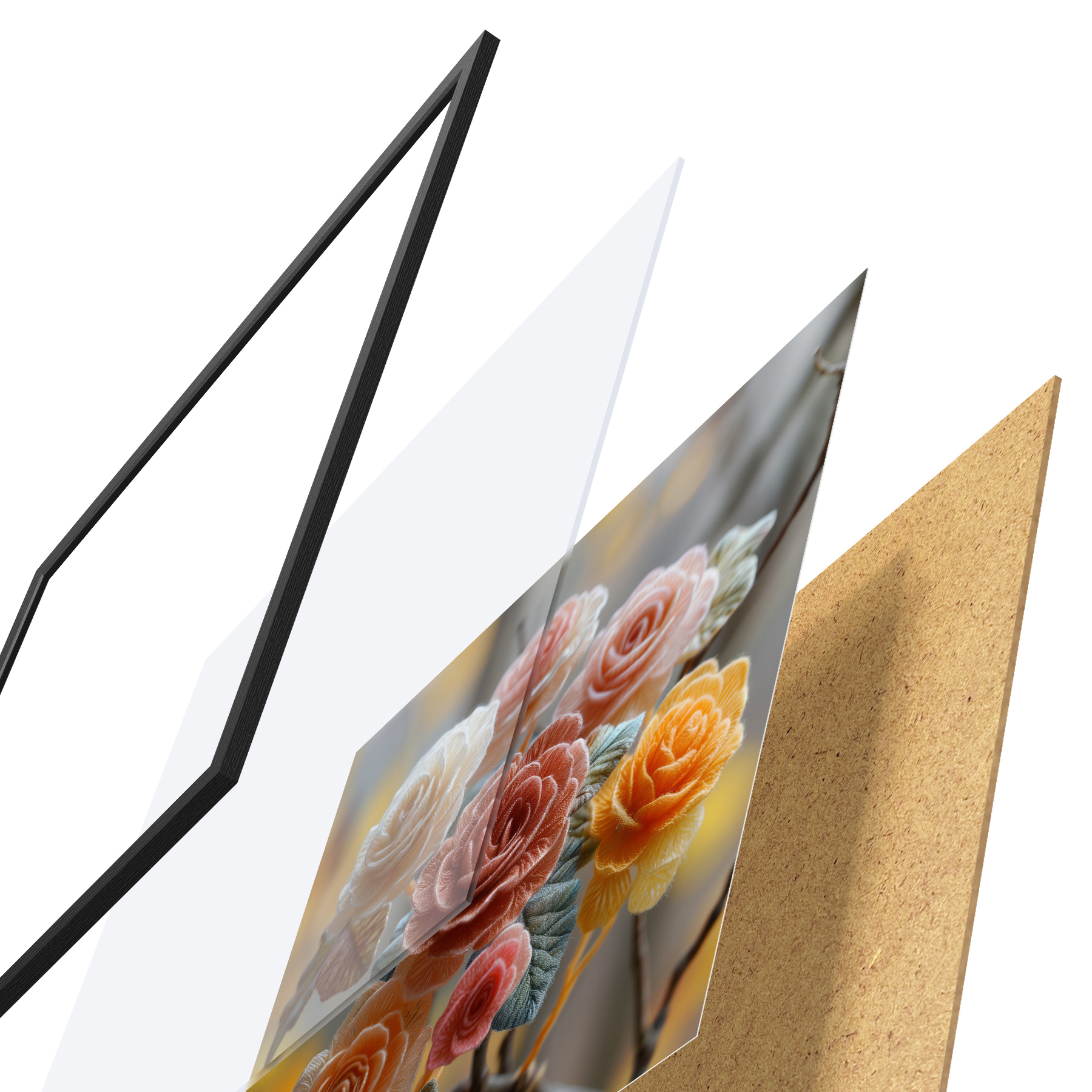 Plakatą sudaro rėmas, pleksiklas, atspausdintas vaizdas ir medžio drožlių plokštės pagrindas. Plakatą galima iš karto pakabinti ant sienos dėl kitoje pusėje esančių laikiklių.